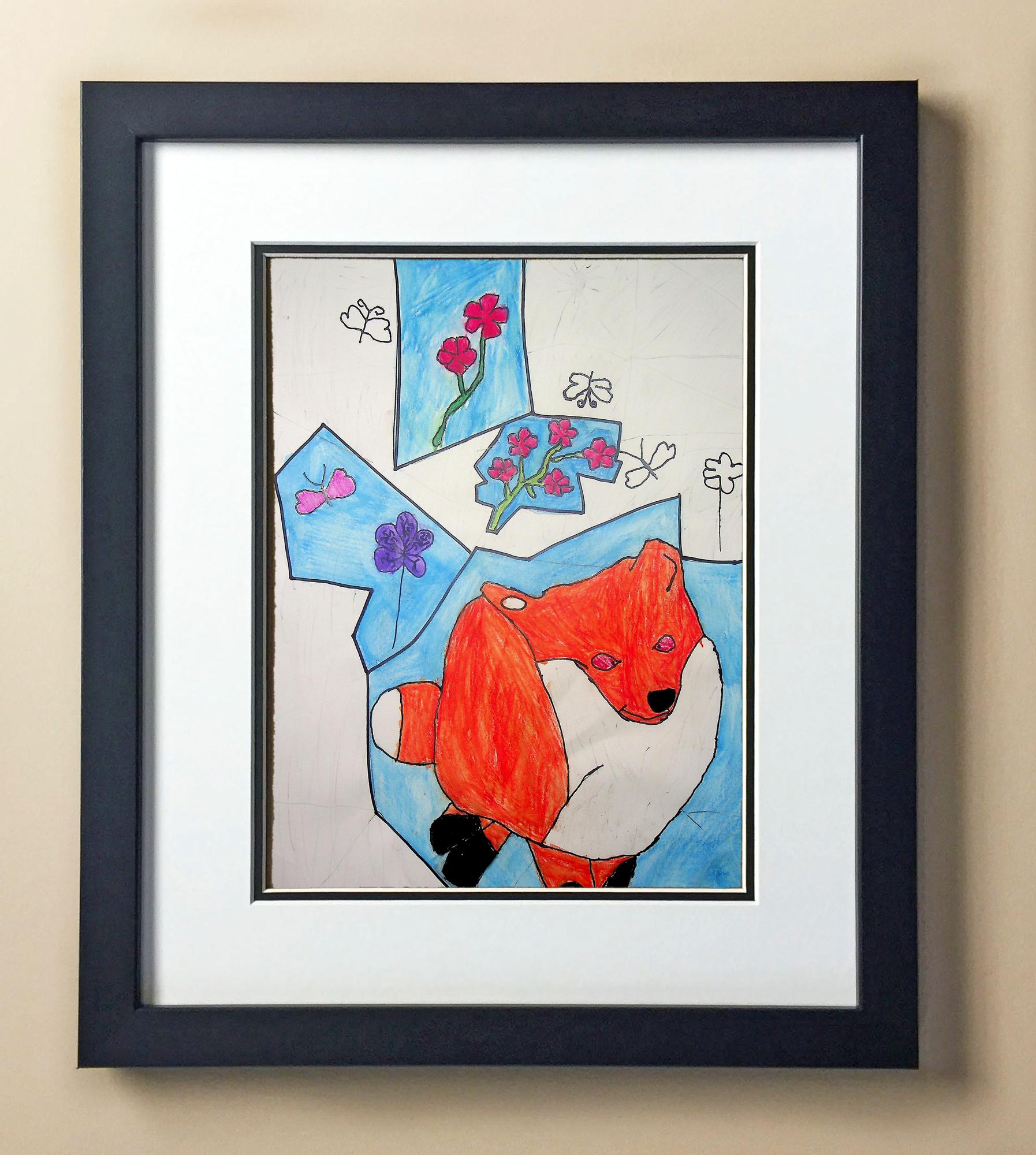 Included with the purchase is the Students Artwork, Frame, double matboard, shatter proof plexiglass, and a ready to hang backerboard with turnbuttons