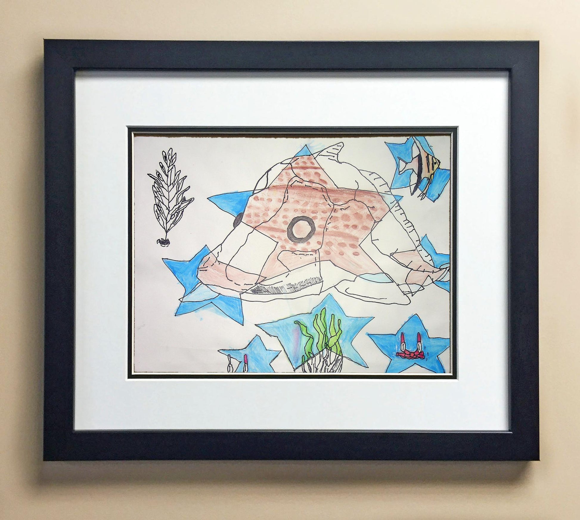 Included with the purchase is the Students Artwork, Frame, double matboard, shatter proof plexiglass, and a ready to hang backerboard with turnbuttons