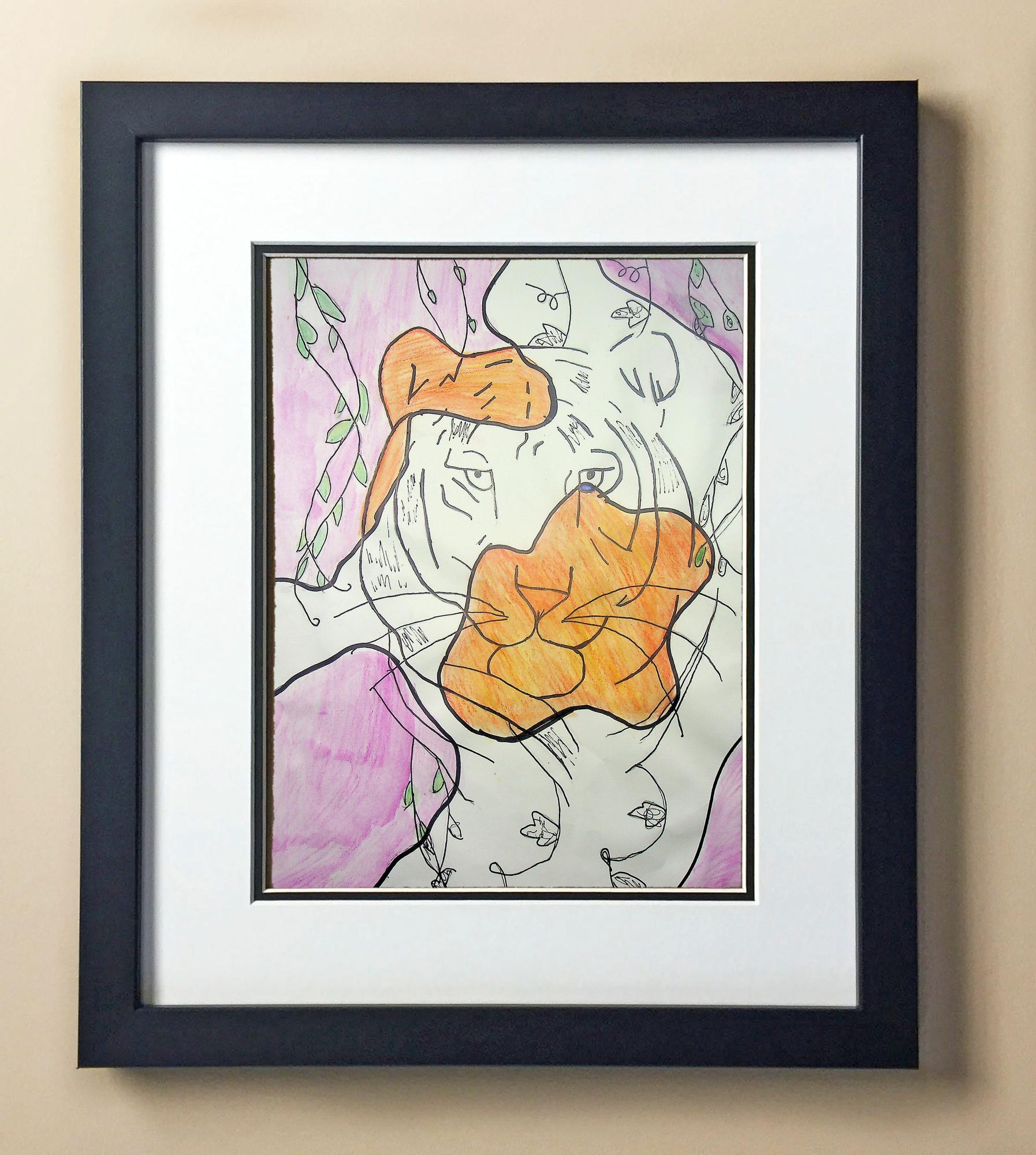 Included with the purchase is the Students Artwork, Frame, double matboard, shatter proof plexiglass, and a ready to hang backerboard with turnbuttons
