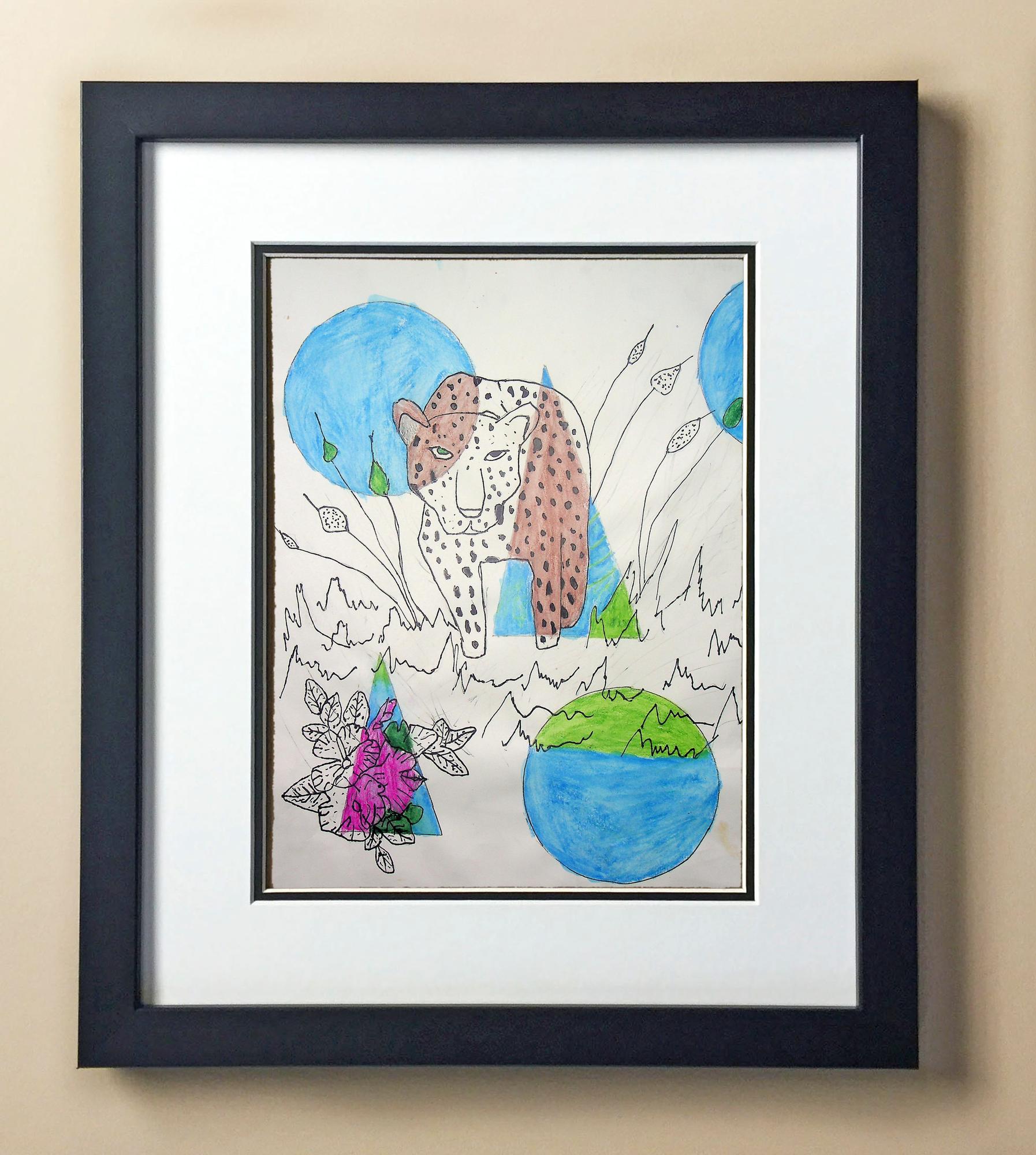 Included with the purchase is the Students Artwork, Frame, double matboard, shatter proof plexiglass, and a ready to hang backerboard with turnbuttons