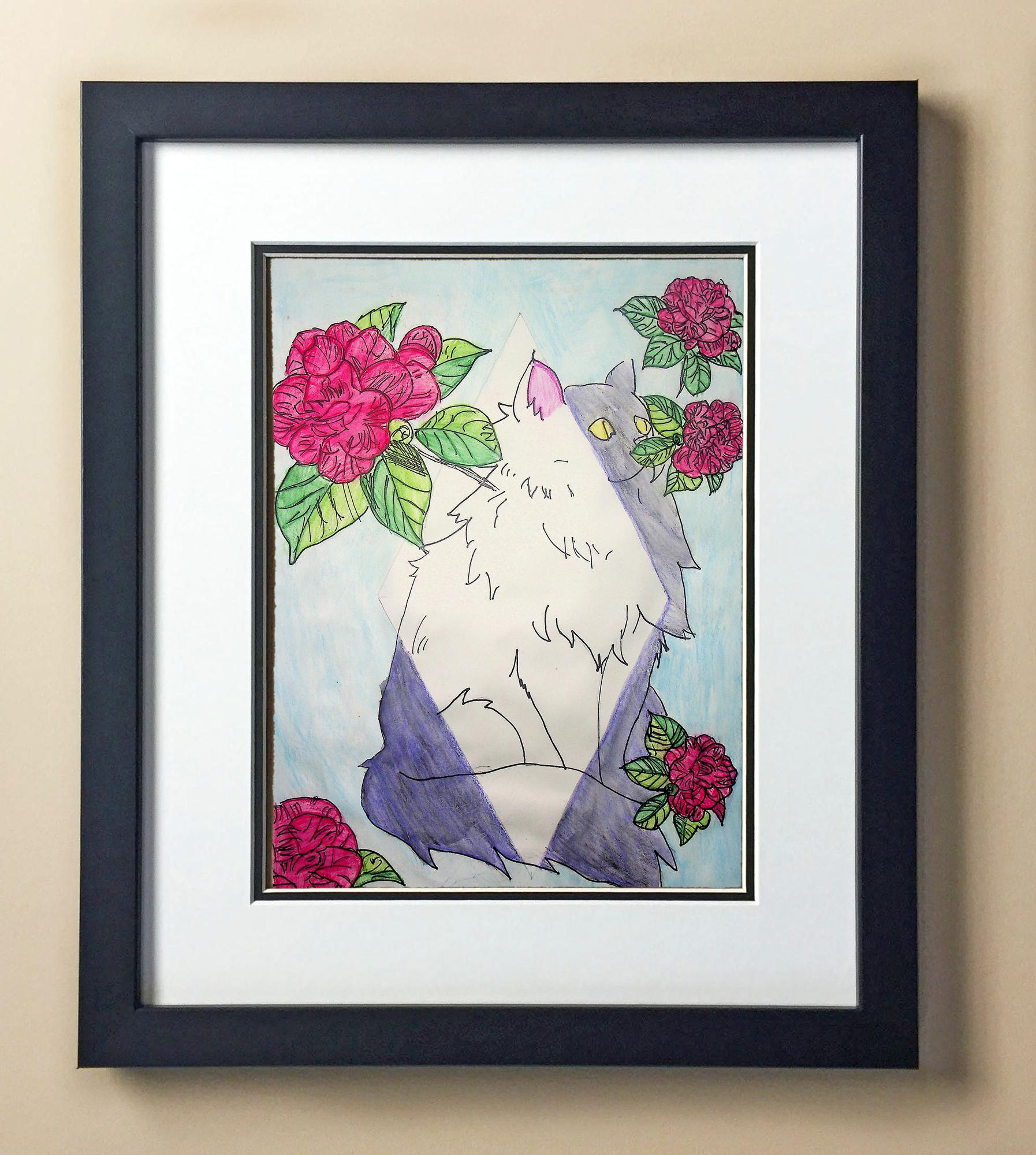 Included with the purchase is the Students Artwork, Frame, double matboard, shatter proof plexiglass, and a ready to hang backerboard with turnbuttons