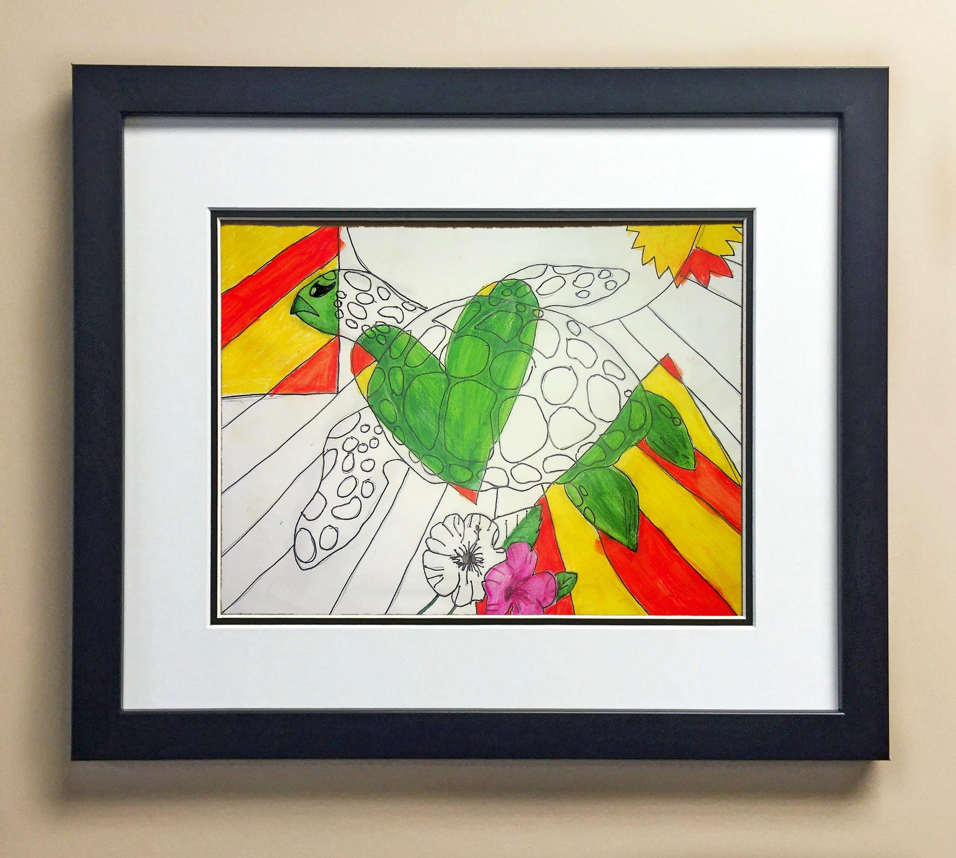 Included with the purchase is the Students Artwork, Frame, double matboard, shatter proof plexiglass, and a ready to hang backerboard with turnbuttons