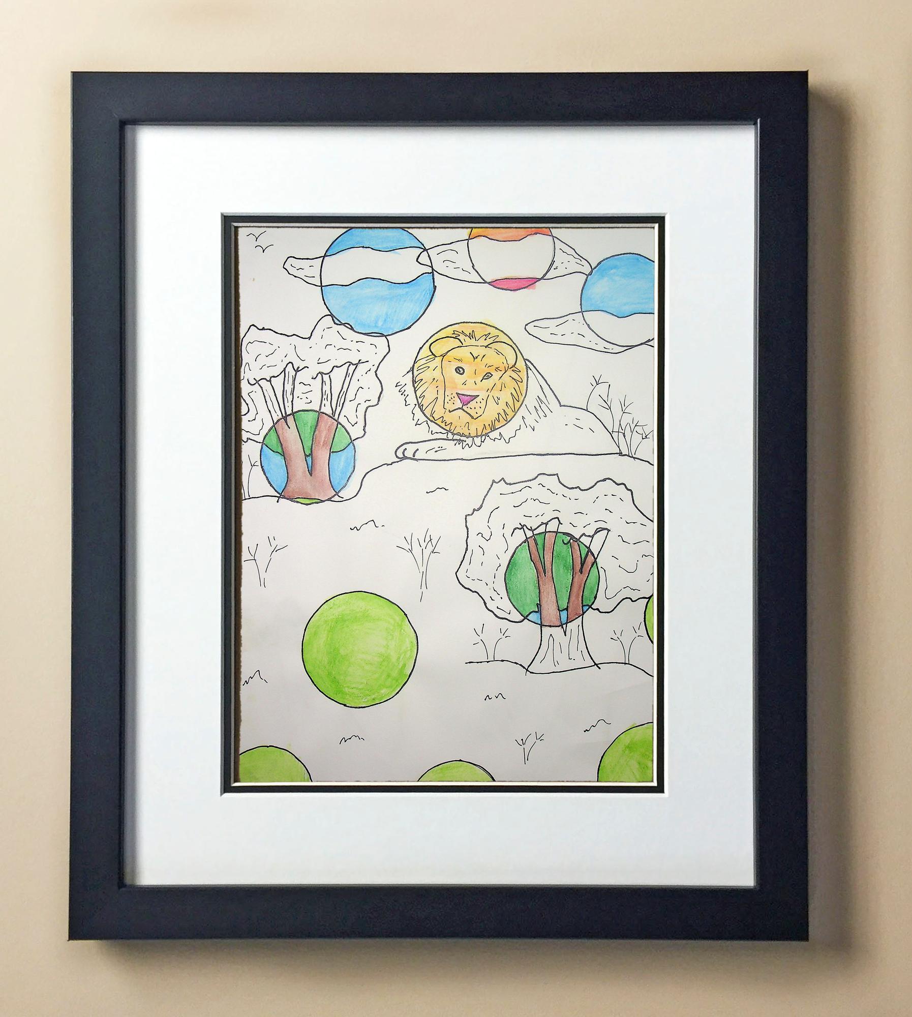 Included with the purchase is the Students Artwork, Frame, double matboard, shatter proof plexiglass, and a ready to hang backerboard with turnbuttons