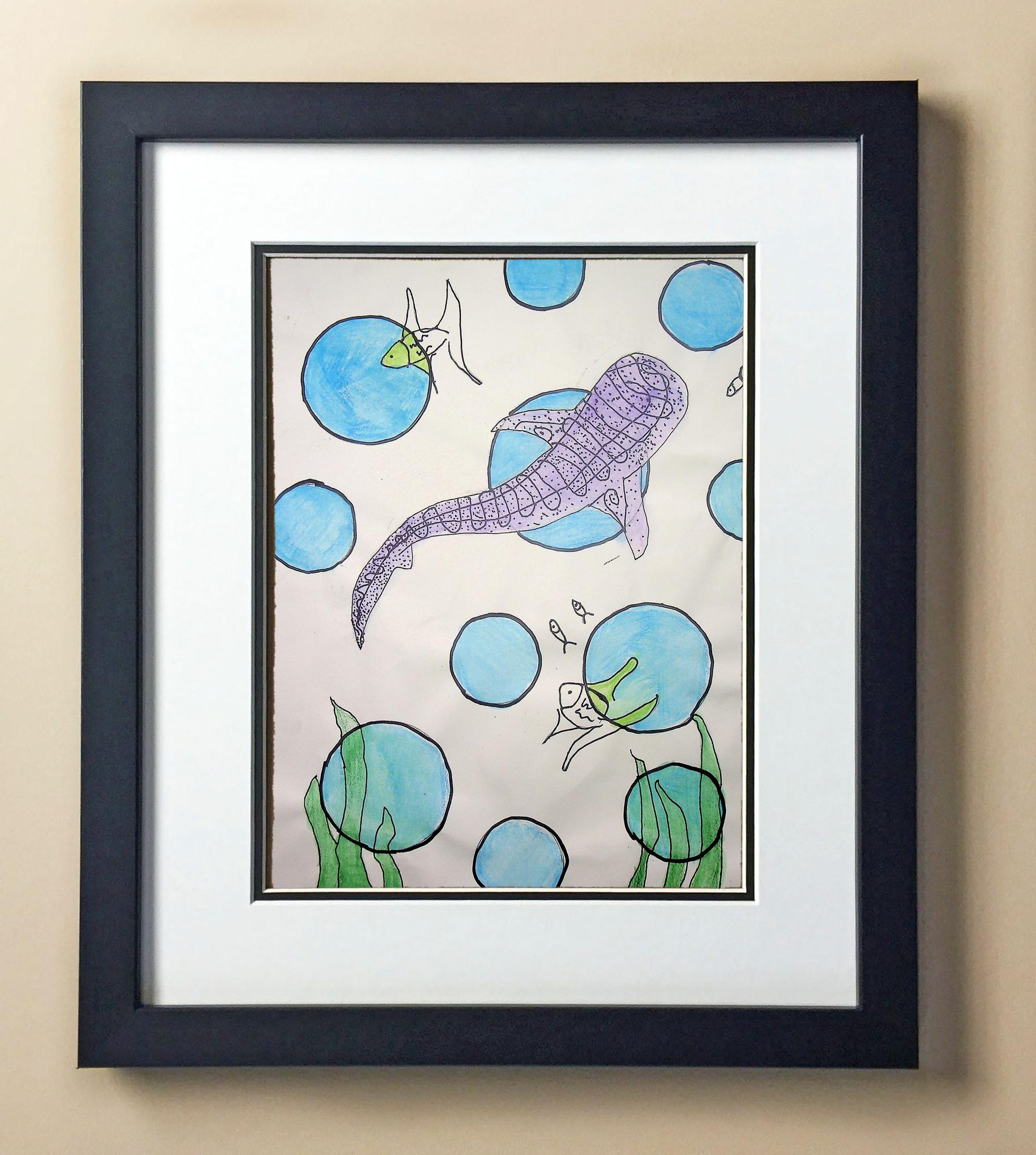 Included with the purchase is the Students Artwork, Frame, double matboard, shatter proof plexiglass, and a ready to hang backerboard with turnbuttons