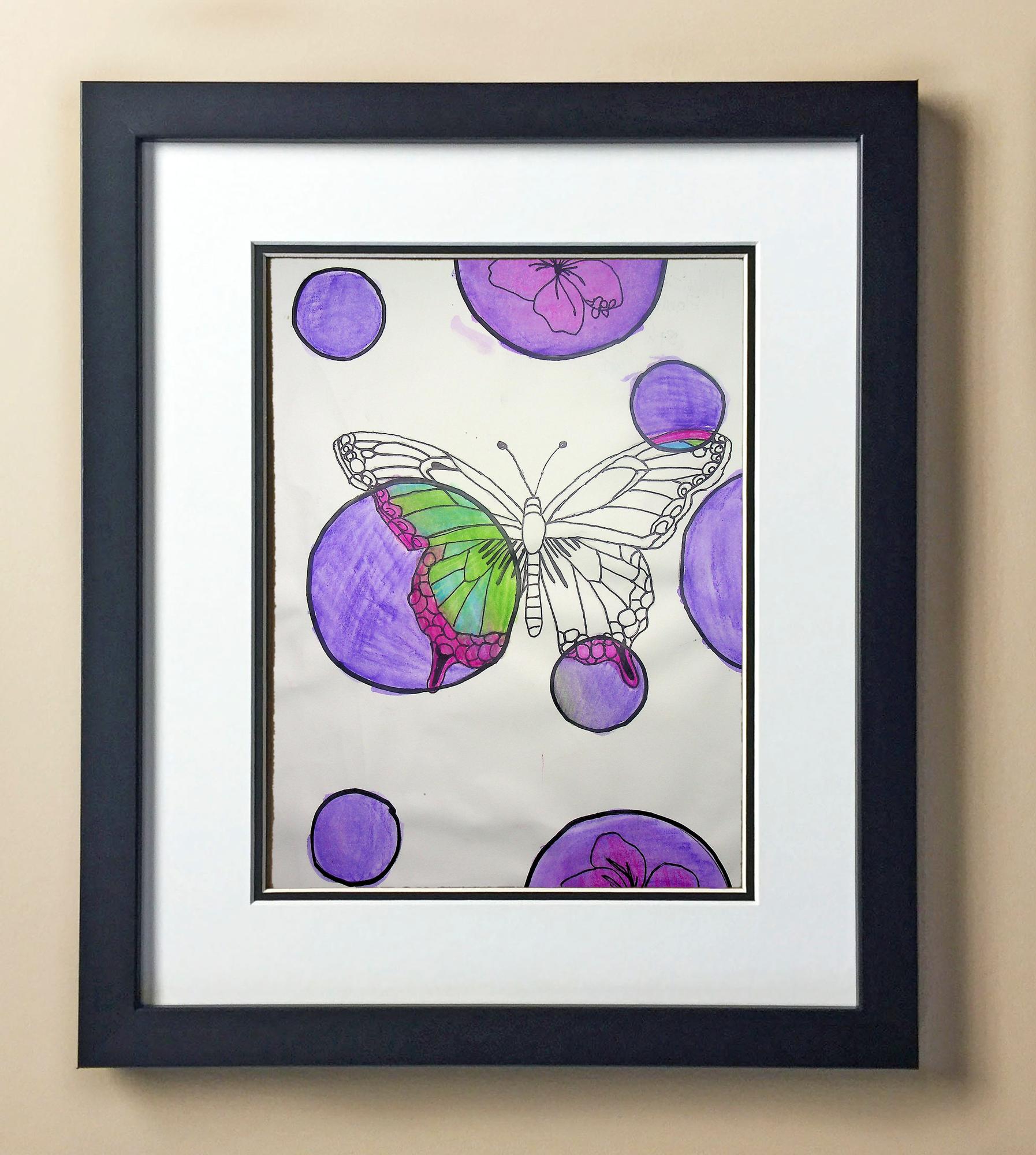 Included with the purchase is the Students Artwork, Frame, double matboard, shatter proof plexiglass, and a ready to hang backerboard with turnbuttons