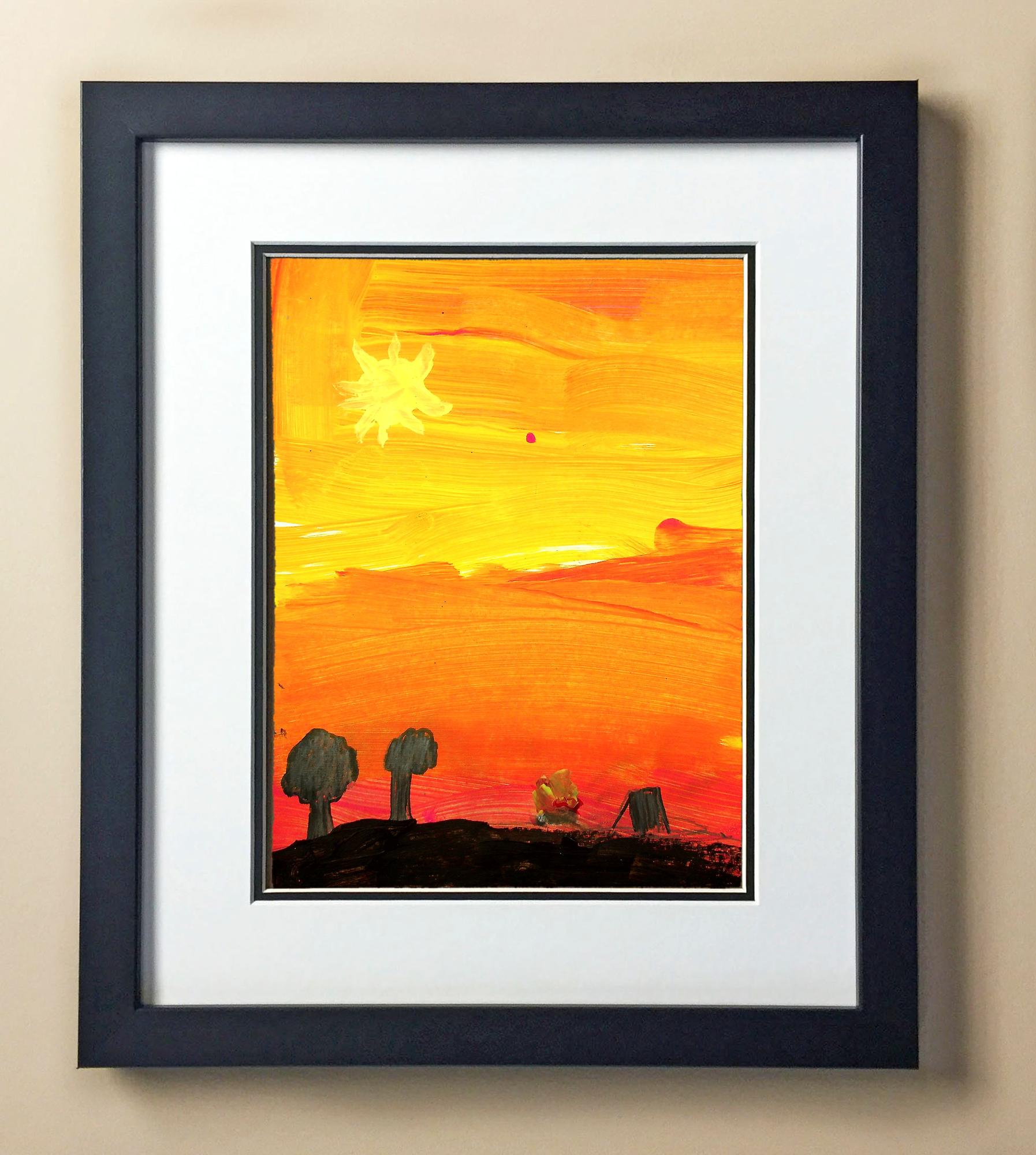 Included with the purchase is the Students Artwork, Frame, double matboard, shatter proof plexiglass, and a ready to hang backerboard with turnbuttons