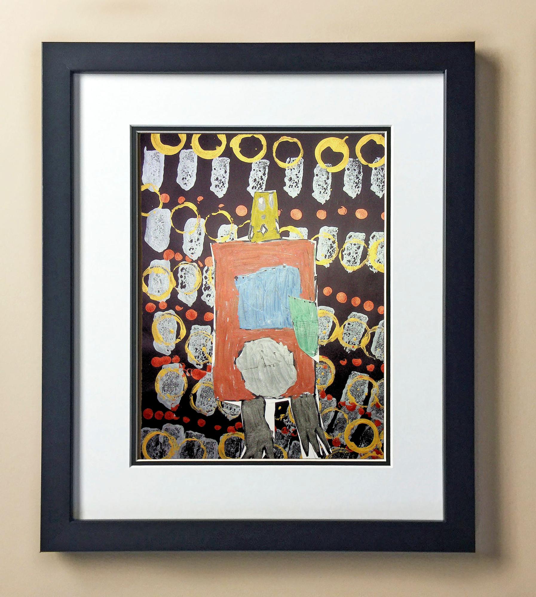 Included with the purchase is the Students Artwork, Frame, double matboard, shatter proof plexiglass, and a ready to hang backerboard with turnbuttons