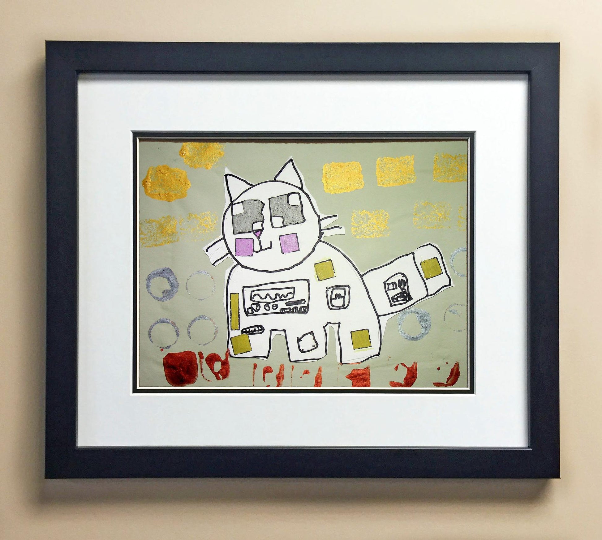 Included with the purchase is the Students Artwork, Frame, double matboard, shatter proof plexiglass, and a ready to hang backerboard with turnbuttons