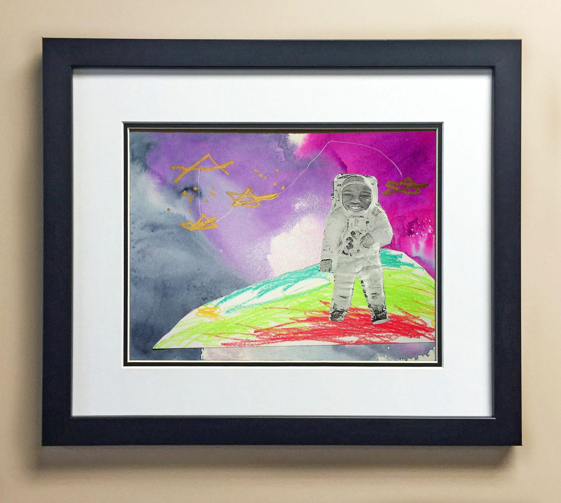 Included with the purchase is the Students Artwork, Frame, double matboard, shatter proof plexiglass, and a ready to hang backerboard with turnbuttons