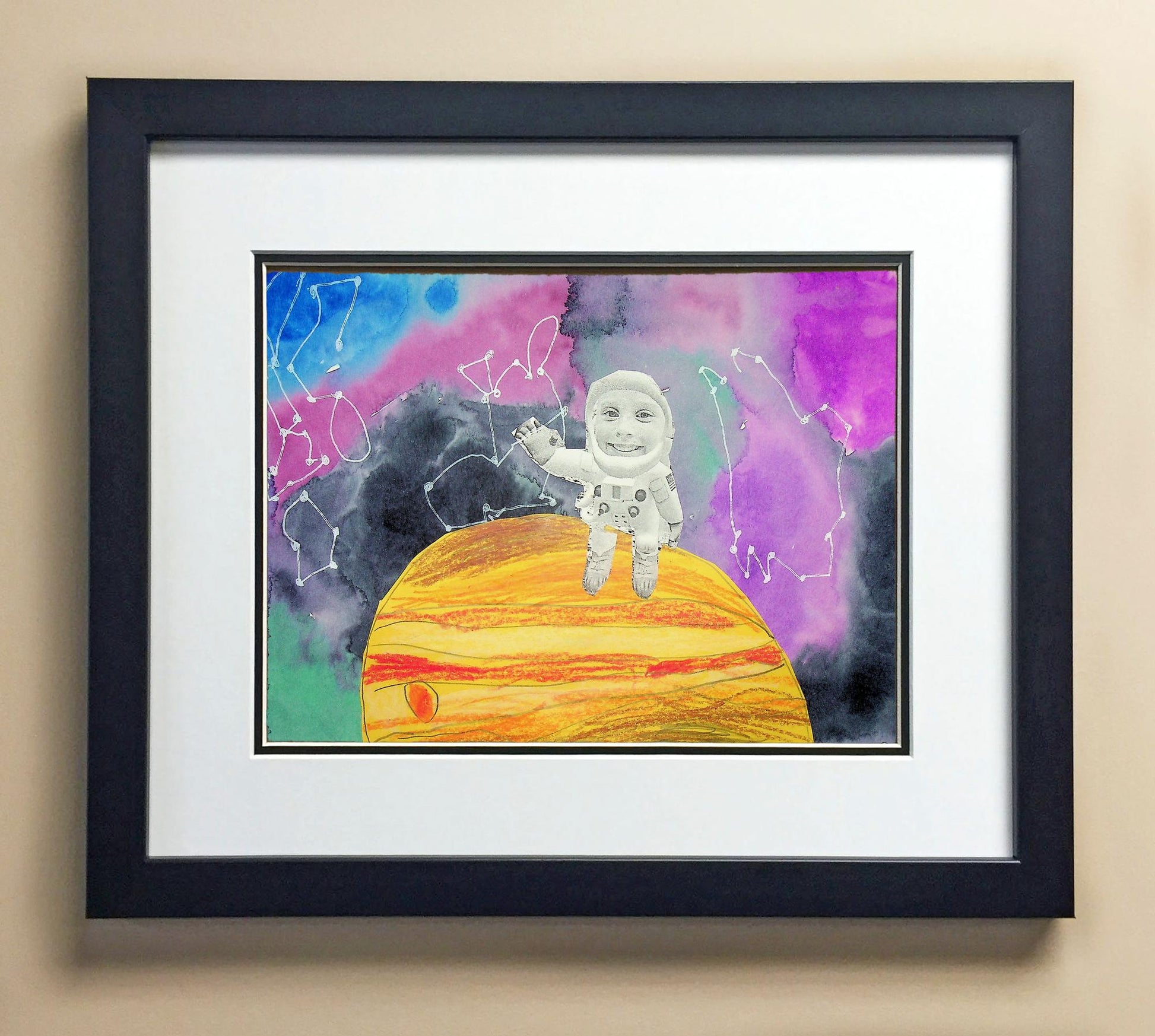 Included with the purchase is the Students Artwork, Frame, double matboard, shatter proof plexiglass, and a ready to hang backerboard with turnbuttons