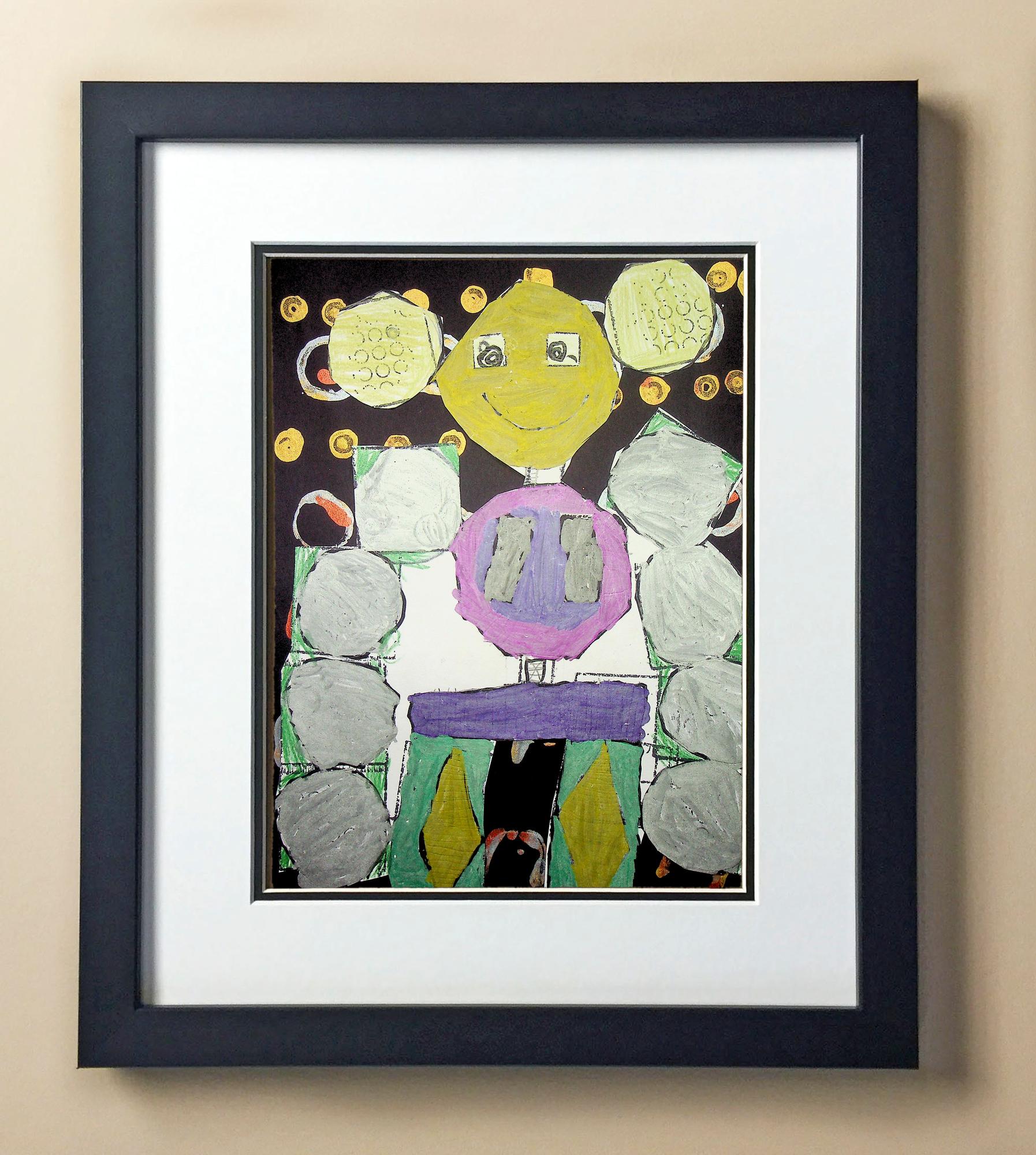 Included with the purchase is the Students Artwork, Frame, double matboard, shatter proof plexiglass, and a ready to hang backerboard with turnbuttons