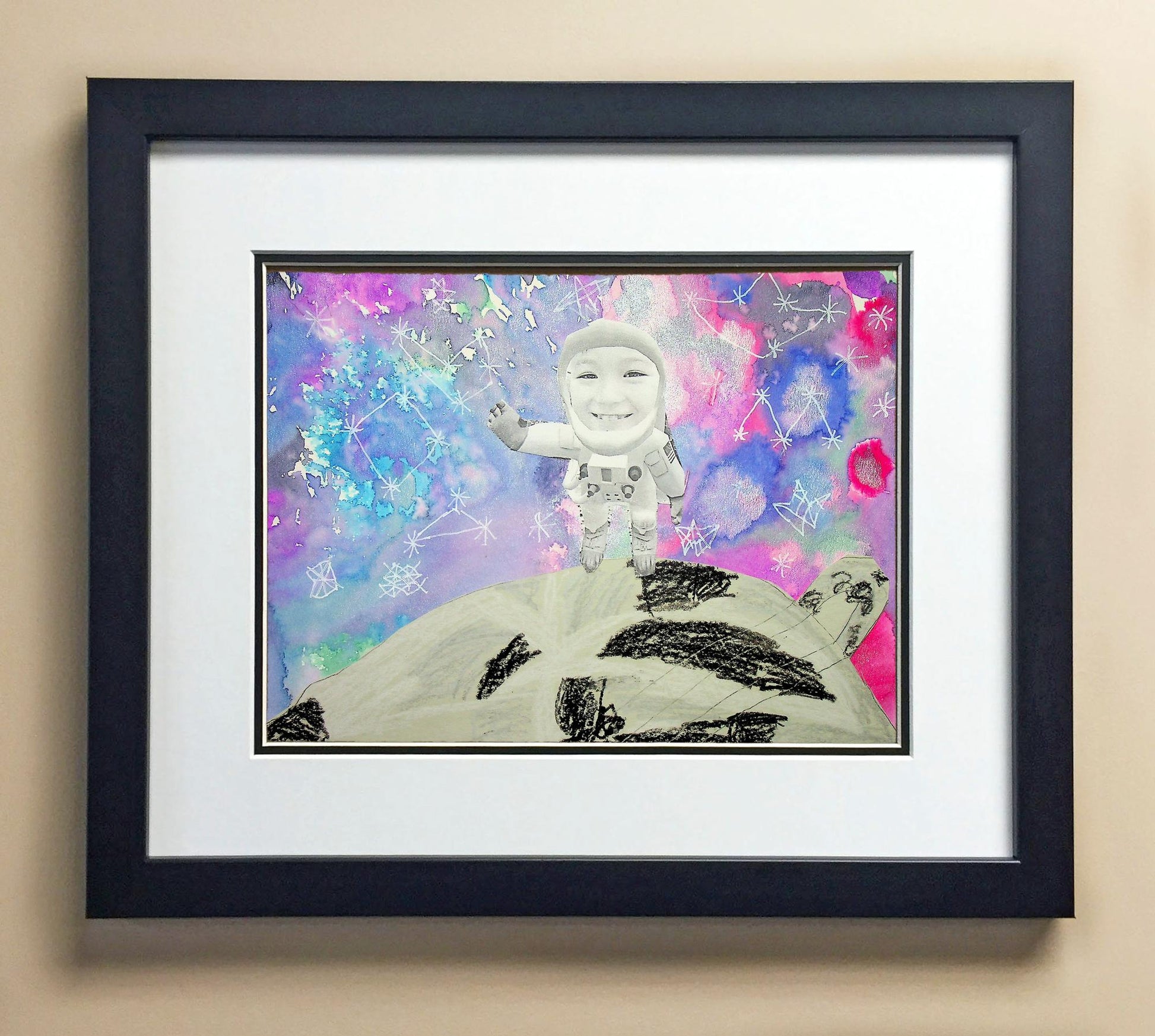 Included with the purchase is the Students Artwork, Frame, double matboard, shatter proof plexiglass, and a ready to hang backerboard with turnbuttons