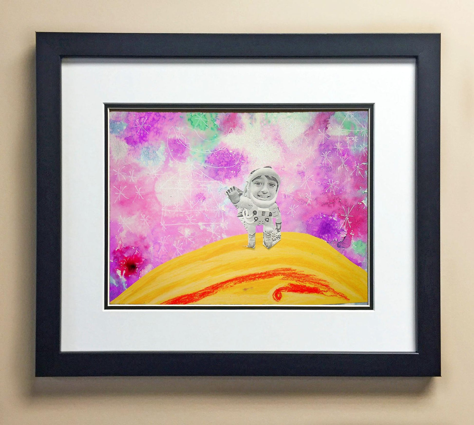 Included with the purchase is the Students Artwork, Frame, double matboard, shatter proof plexiglass, and a ready to hang backerboard with turnbuttons