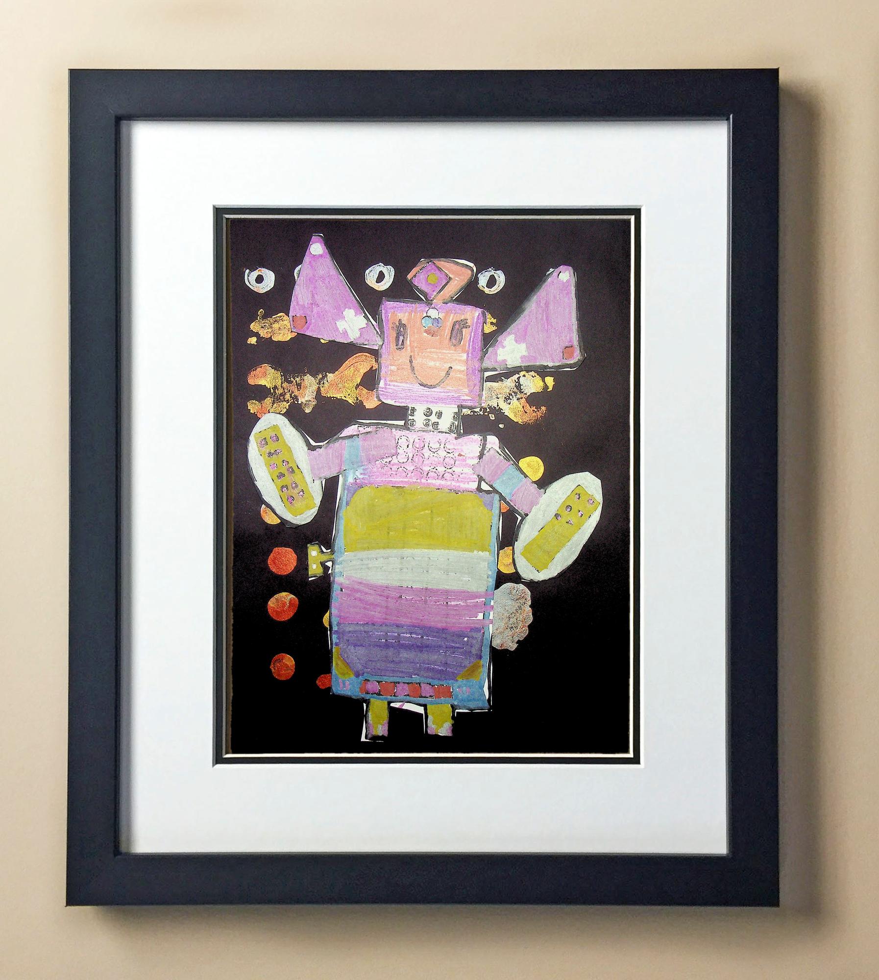 Included with the purchase is the Students Artwork, Frame, double matboard, shatter proof plexiglass, and a ready to hang backerboard with turnbuttons