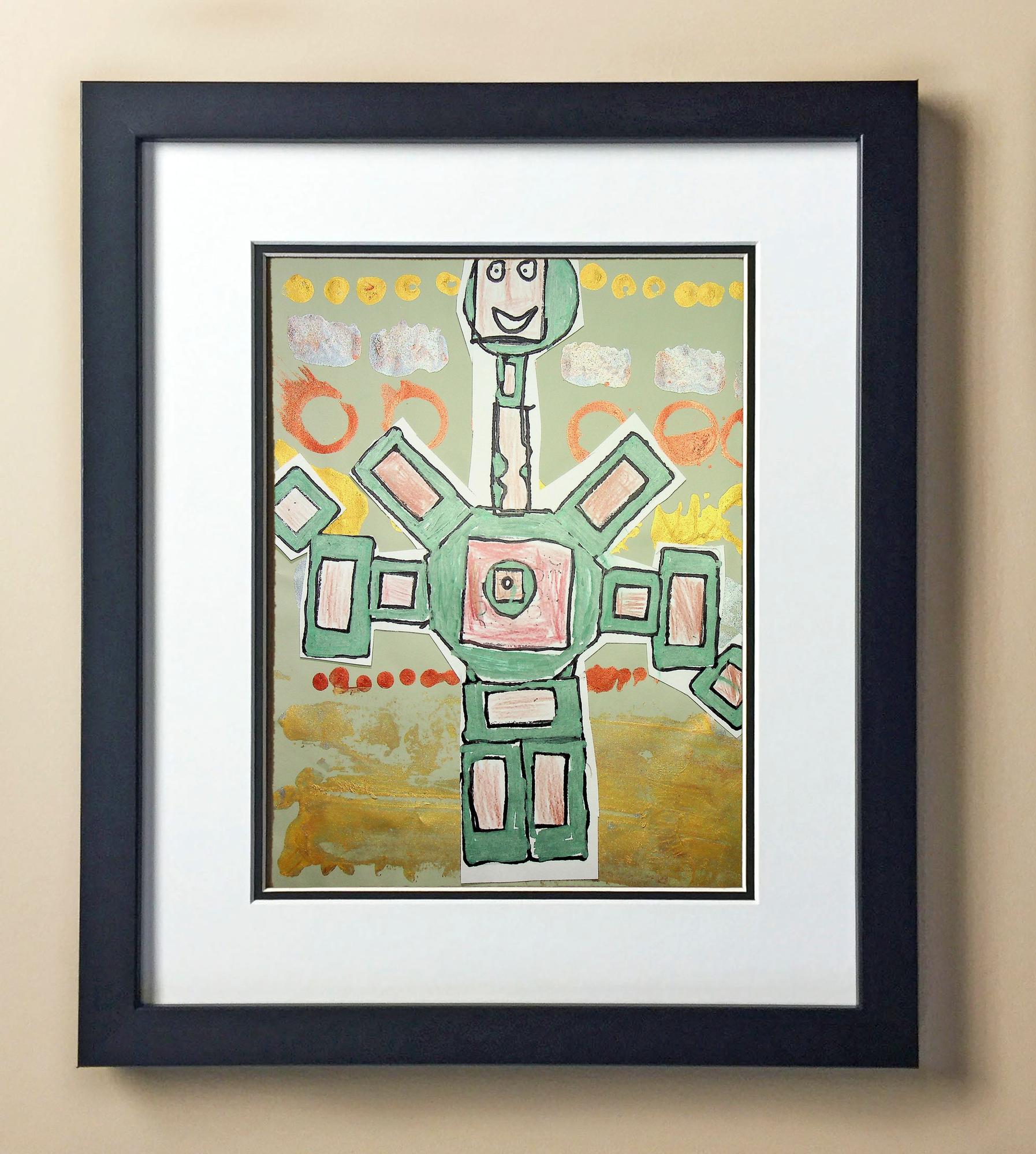Included with the purchase is the Students Artwork, Frame, double matboard, shatter proof plexiglass, and a ready to hang backerboard with turnbuttons