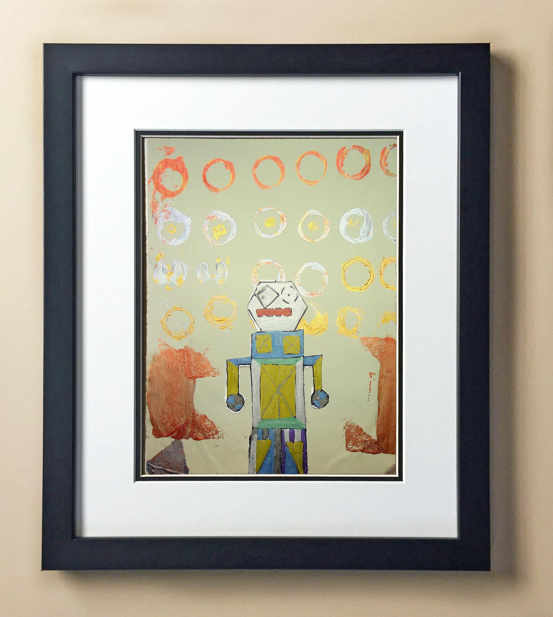 Included with the purchase is the Students Artwork, Frame, double matboard, shatter proof plexiglass, and a ready to hang backerboard with turnbuttons
