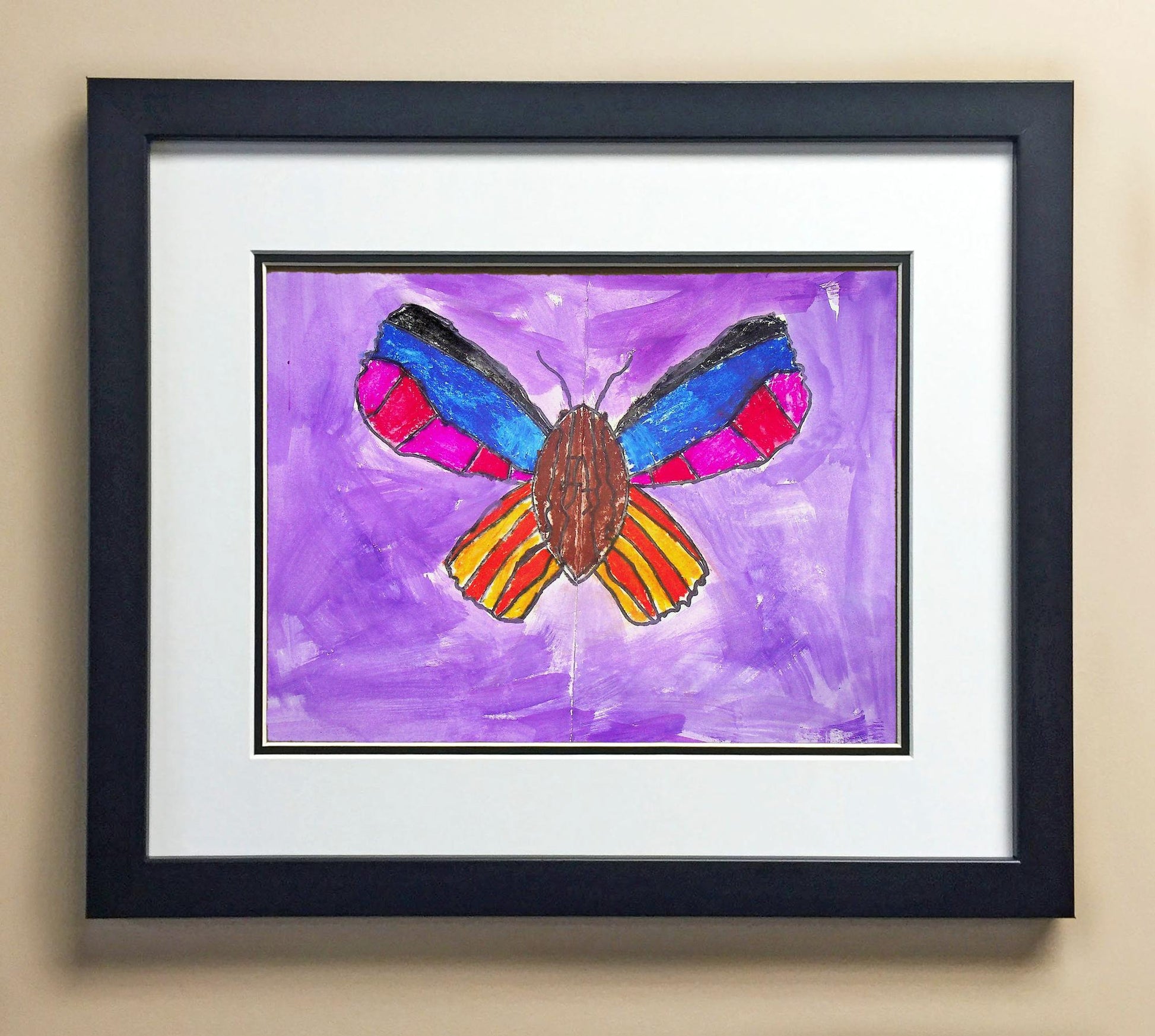 Included with the purchase is the Students Artwork, Frame, double matboard, shatter proof plexiglass, and a ready to hang backerboard with turnbuttons