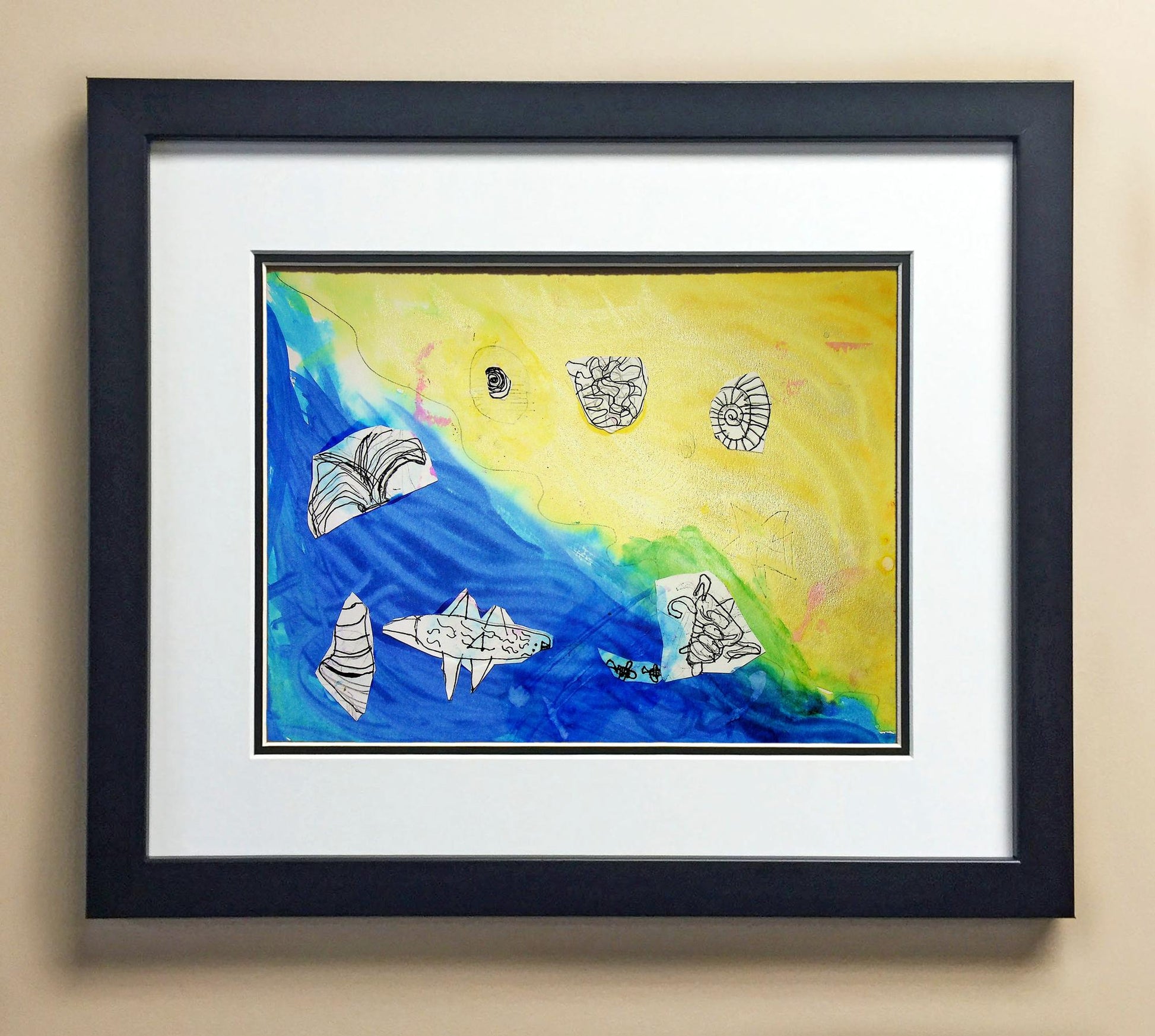 Included with the purchase is the Students Artwork, Frame, double matboard, shatter proof plexiglass, and a ready to hang backerboard with turnbuttons