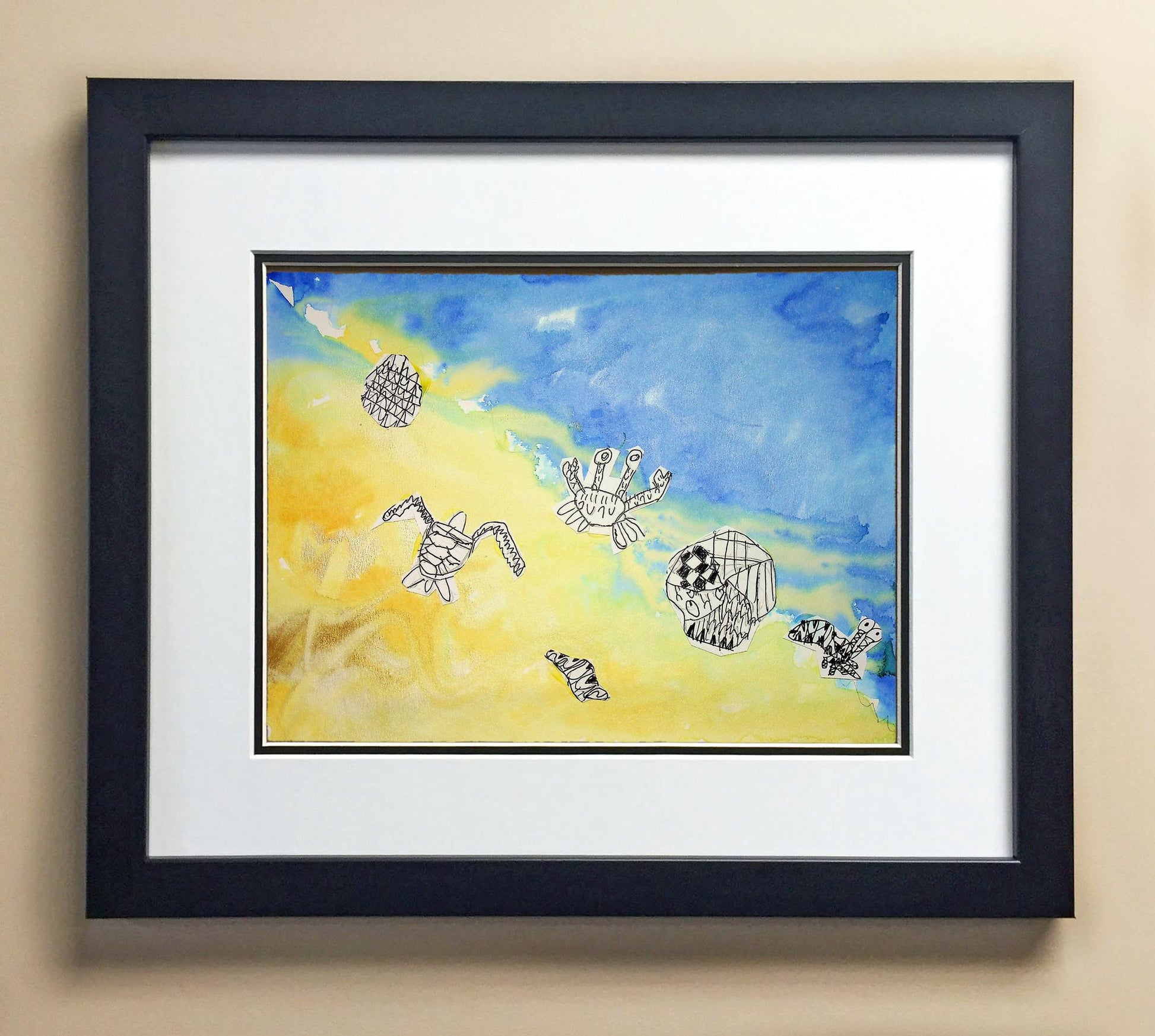 Included with the purchase is the Students Artwork, Frame, double matboard, shatter proof plexiglass, and a ready to hang backerboard with turnbuttons
