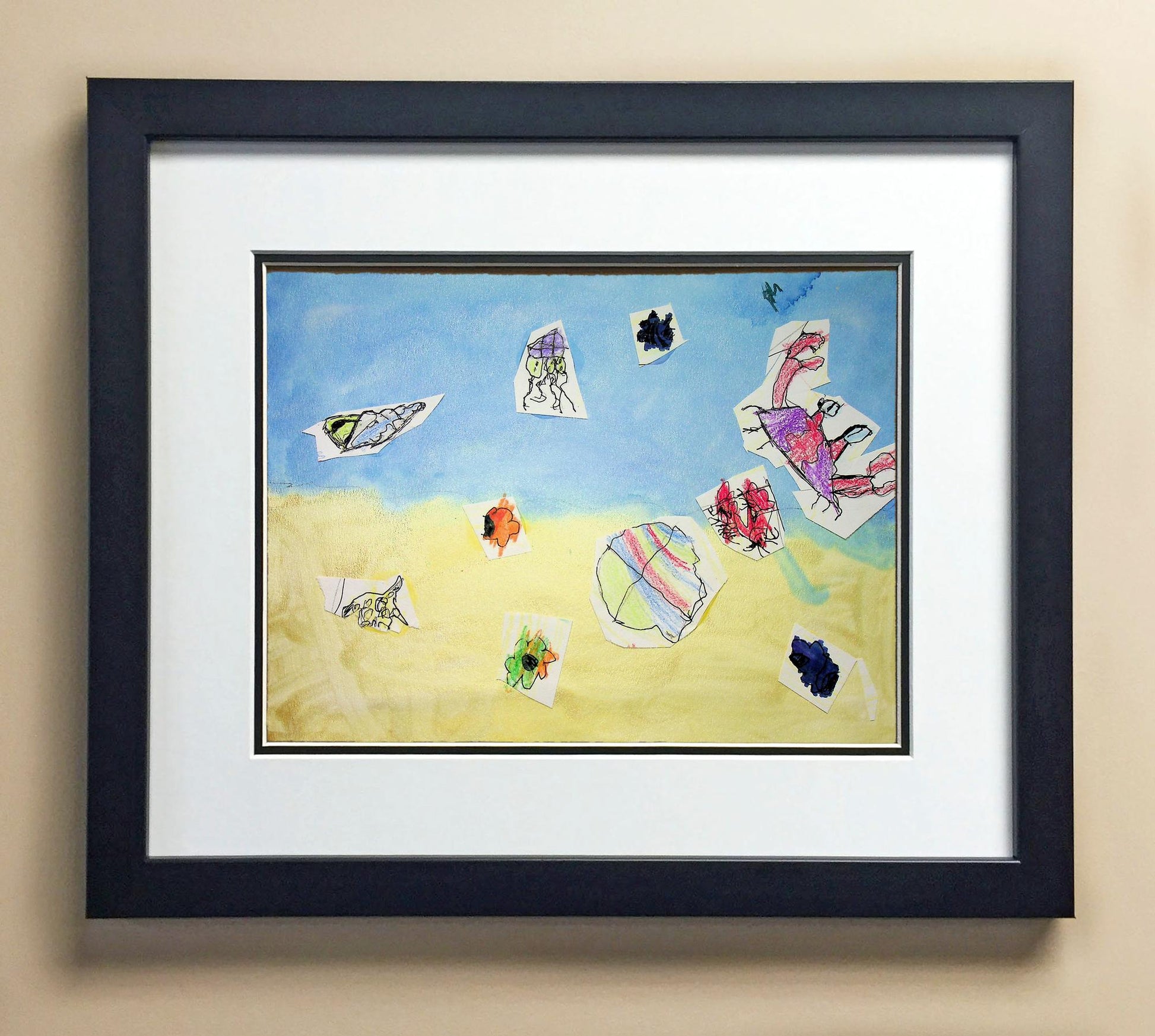 Included with the purchase is the Students Artwork, Frame, double matboard, shatter proof plexiglass, and a ready to hang backerboard with turnbuttons