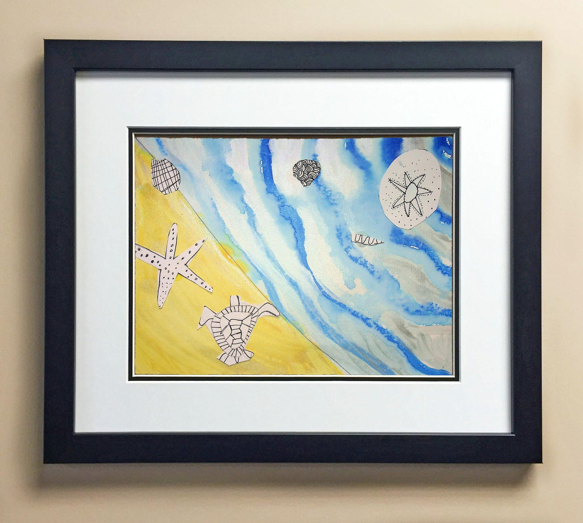 Included with the purchase is the Students Artwork, Frame, double matboard, shatter proof plexiglass, and a ready to hang backerboard with turnbuttons