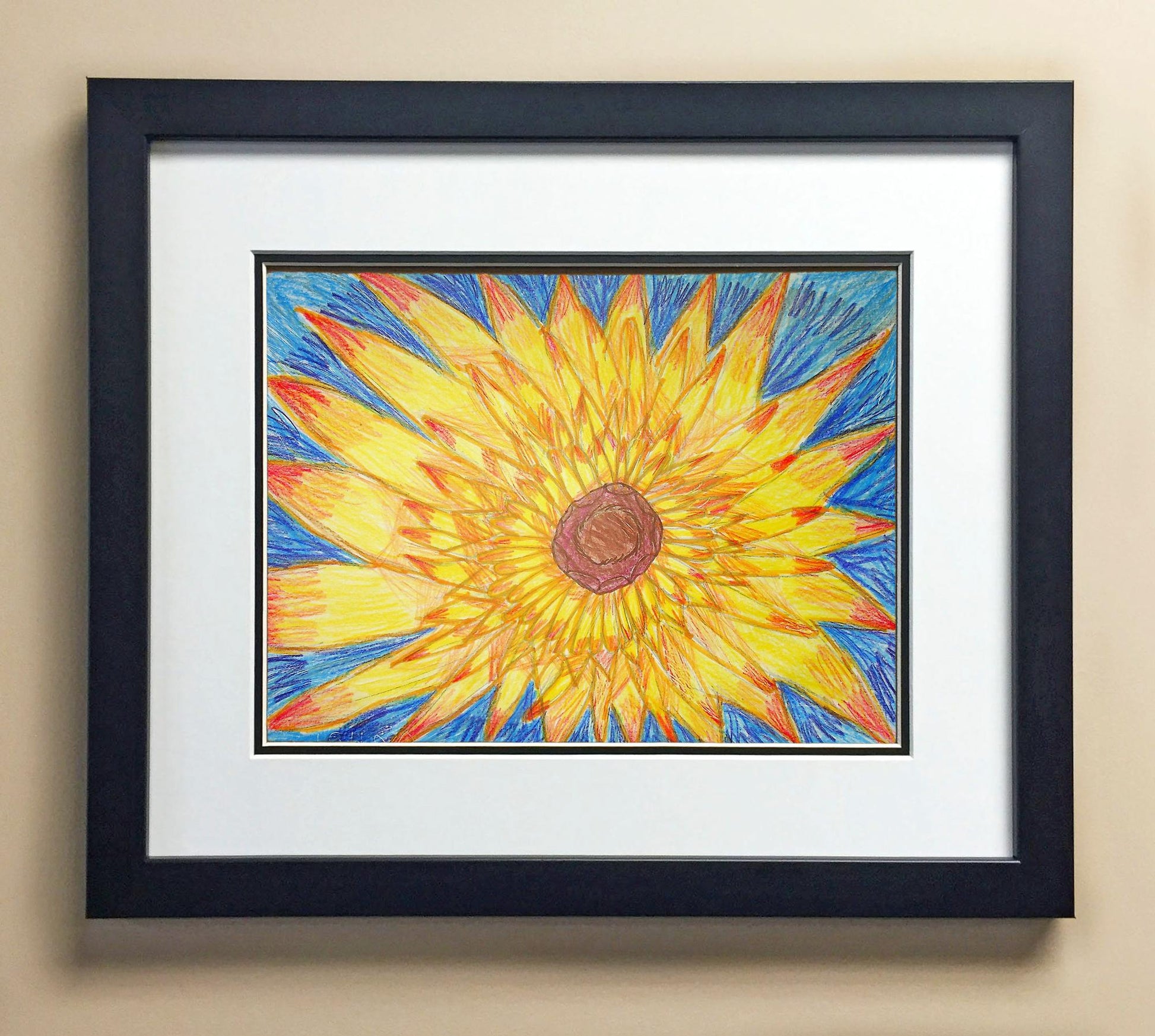 Included with the purchase is the Students Artwork, Frame, double matboard, shatter proof plexiglass, and a ready to hang backerboard with turnbuttons