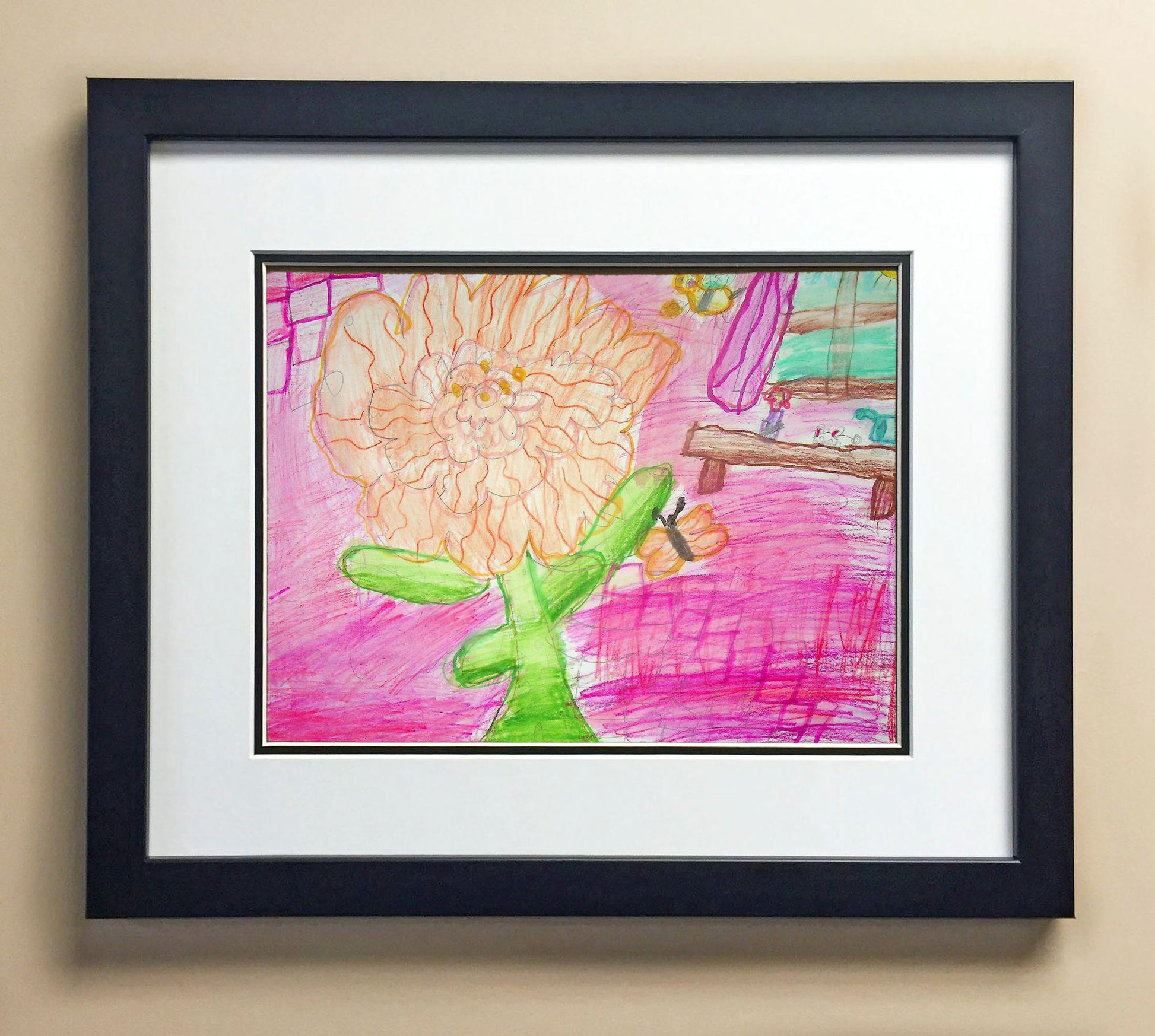 Included with the purchase is the Students Artwork, Frame, double matboard, shatter proof plexiglass, and a ready to hang backerboard with turnbuttons