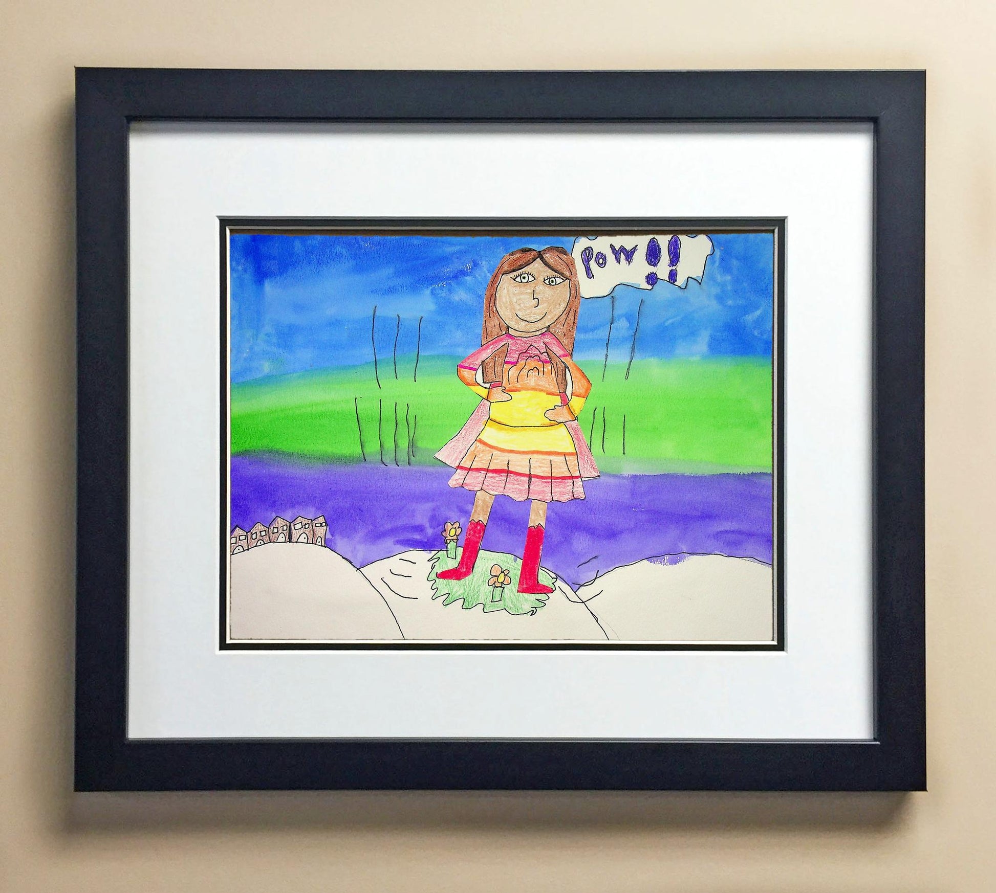 Included with the purchase is the Students Artwork, Frame, double matboard, shatter proof plexiglass, and a ready to hang backerboard with turnbuttons