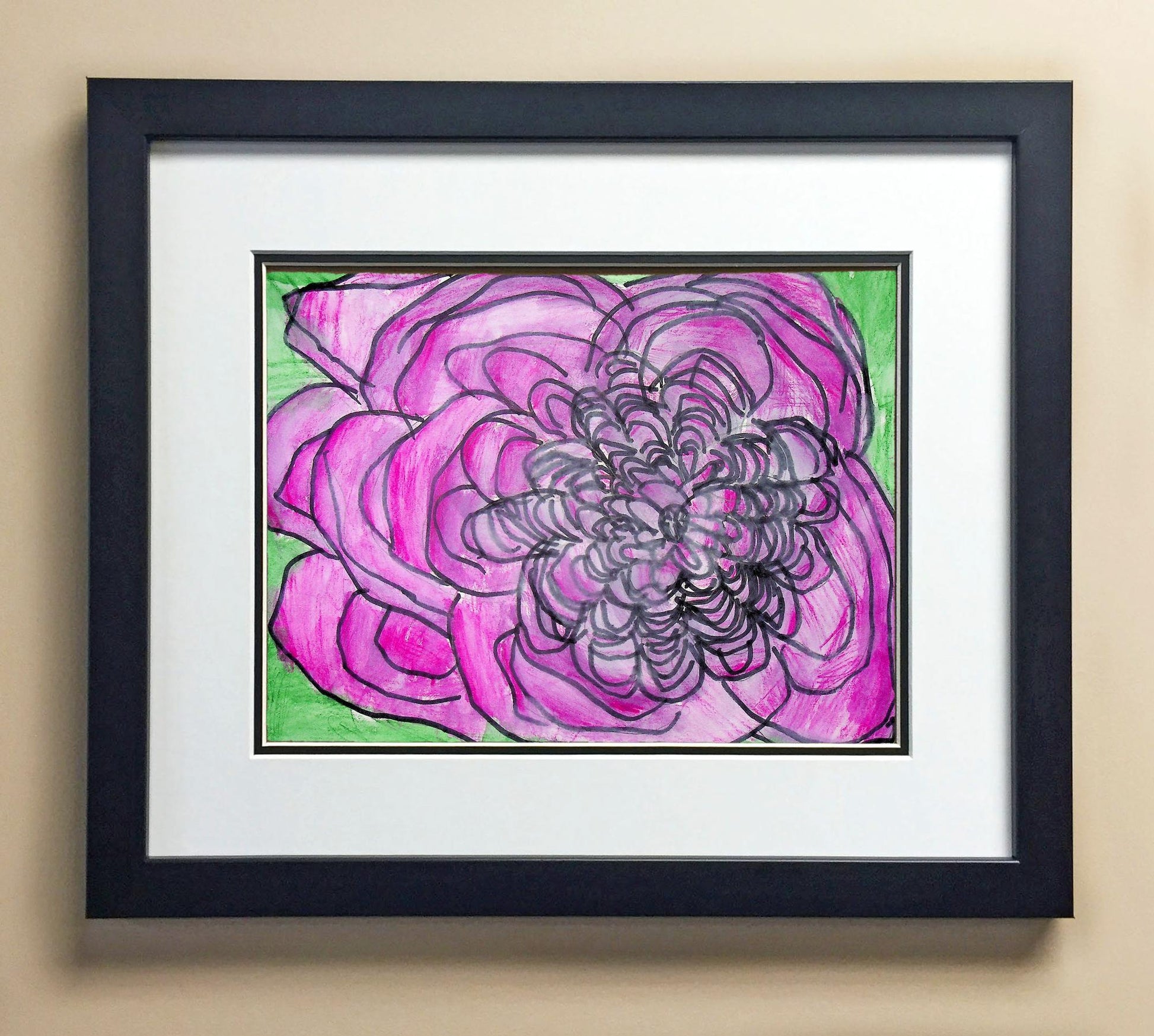 Included with the purchase is the Students Artwork, Frame, double matboard, shatter proof plexiglass, and a ready to hang backerboard with turnbuttons