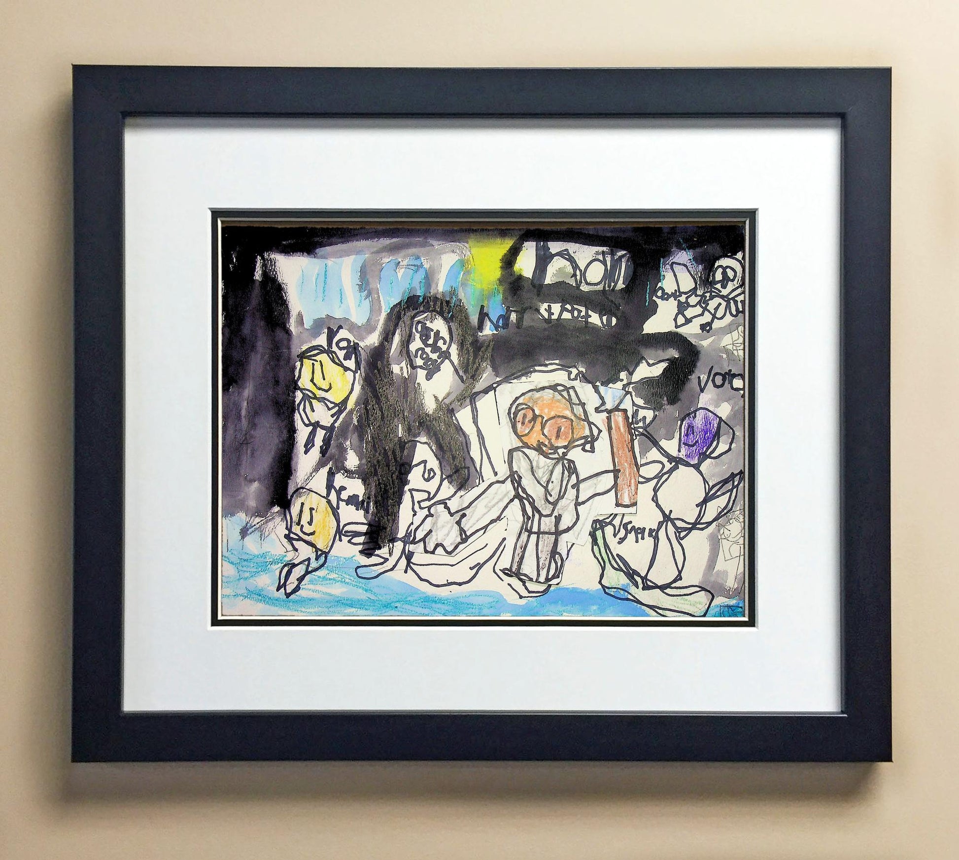 Included with the purchase is the Students Artwork, Frame, double matboard, shatter proof plexiglass, and a ready to hang backerboard with turnbuttons