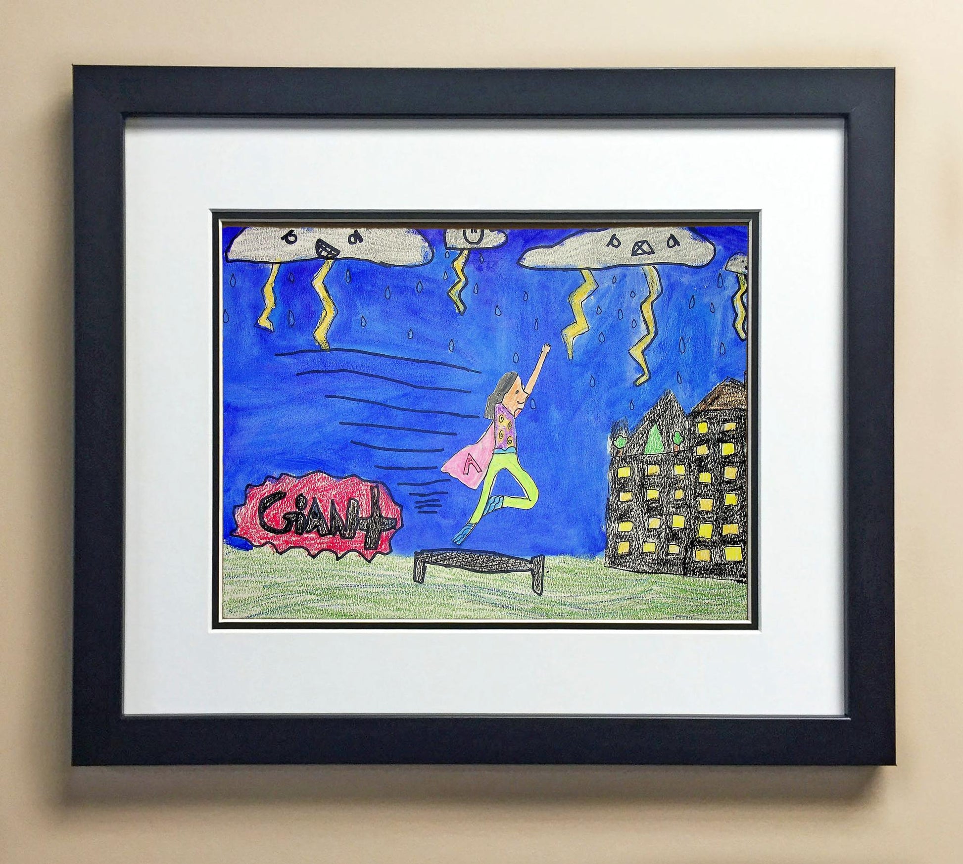 Included with the purchase is the Students Artwork, Frame, double matboard, shatter proof plexiglass, and a ready to hang backerboard with turnbuttons