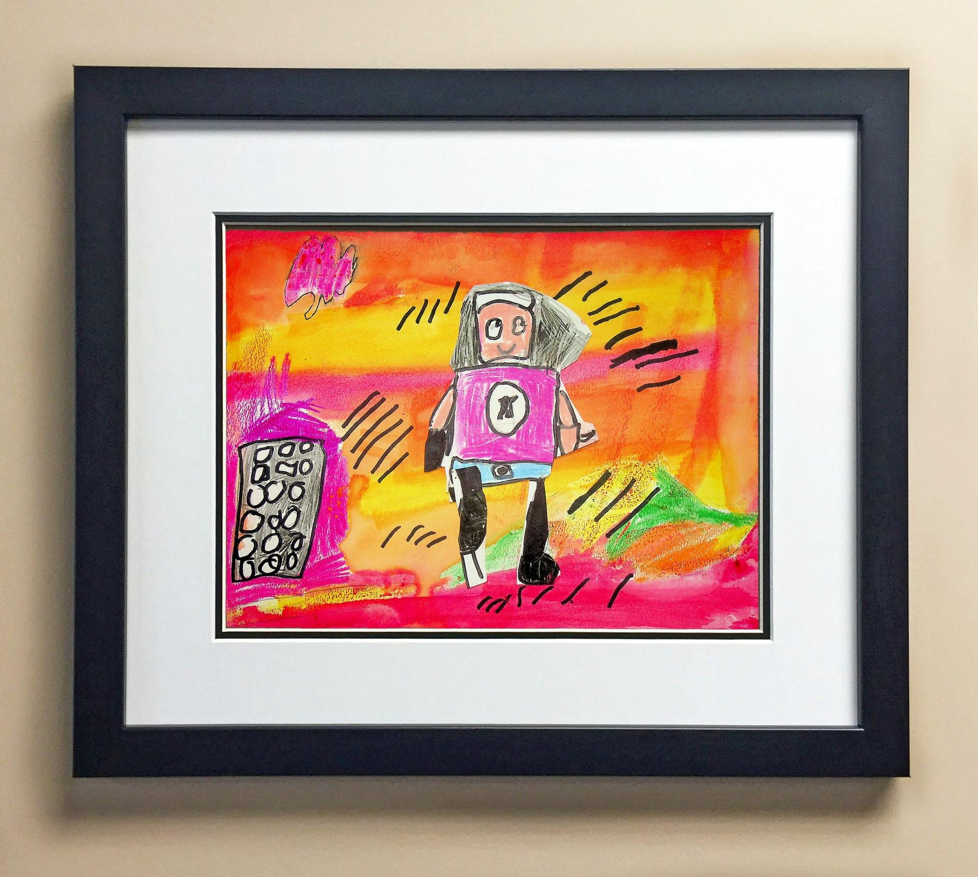Included with the purchase is the Students Artwork, Frame, double matboard, shatter proof plexiglass, and a ready to hang backerboard with turnbuttons