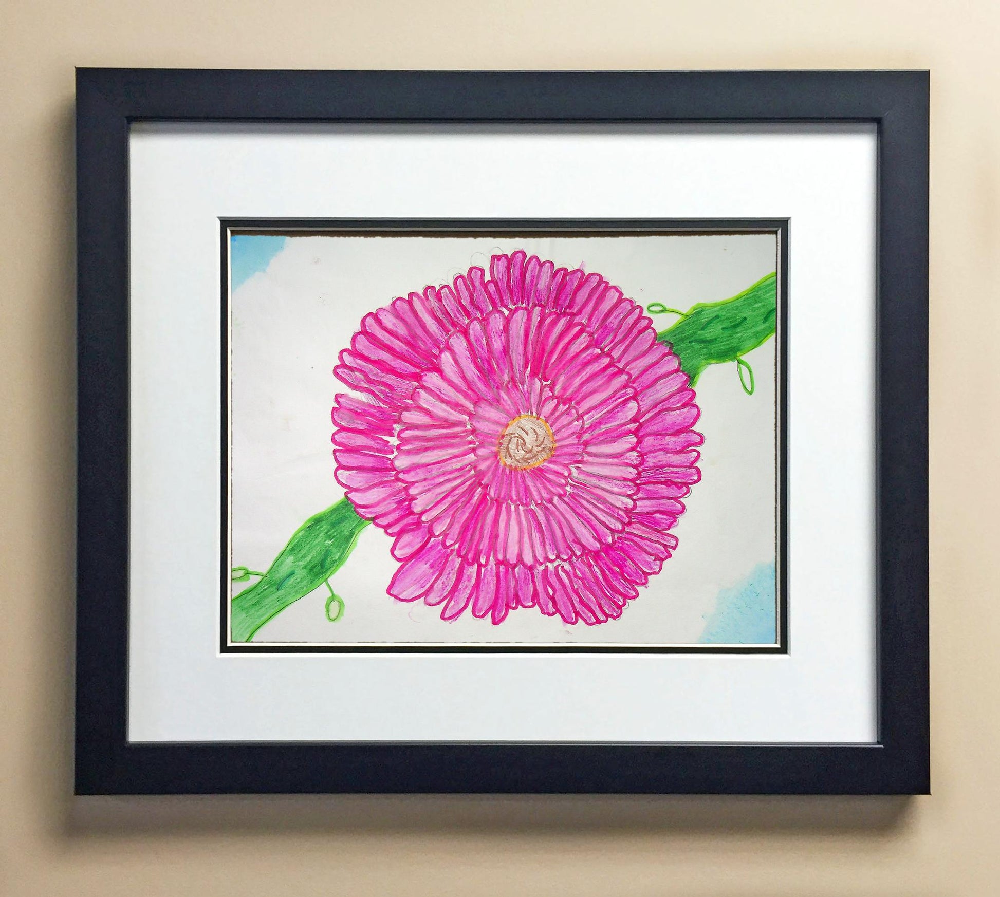 Included with the purchase is the Students Artwork, Frame, double matboard, shatter proof plexiglass, and a ready to hang backerboard with turnbuttons