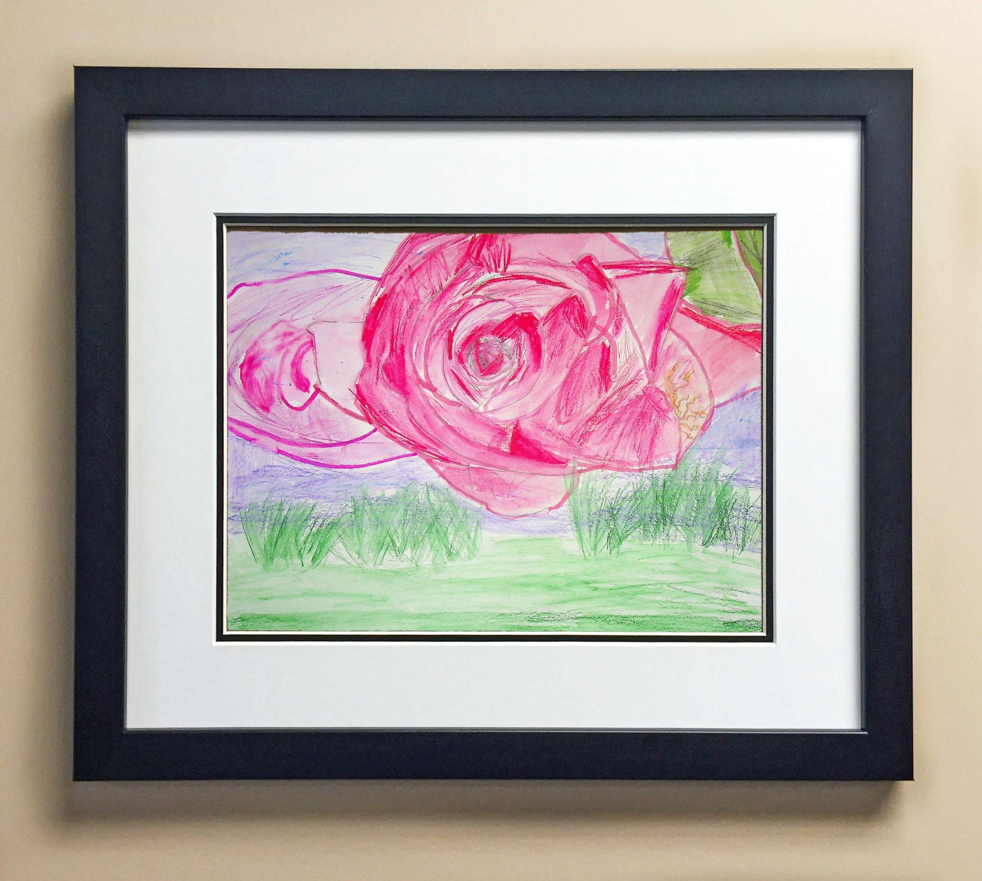 Included with the purchase is the Students Artwork, Frame, double matboard, shatter proof plexiglass, and a ready to hang backerboard with turnbuttons