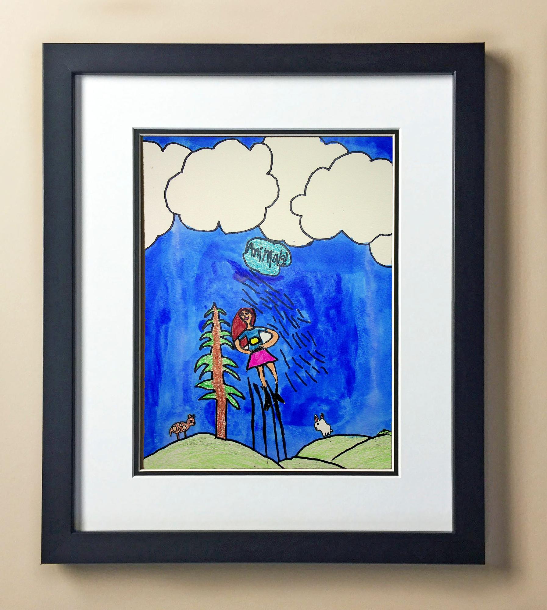 Included with the purchase is the Students Artwork, Frame, double matboard, shatter proof plexiglass, and a ready to hang backerboard with turnbuttons