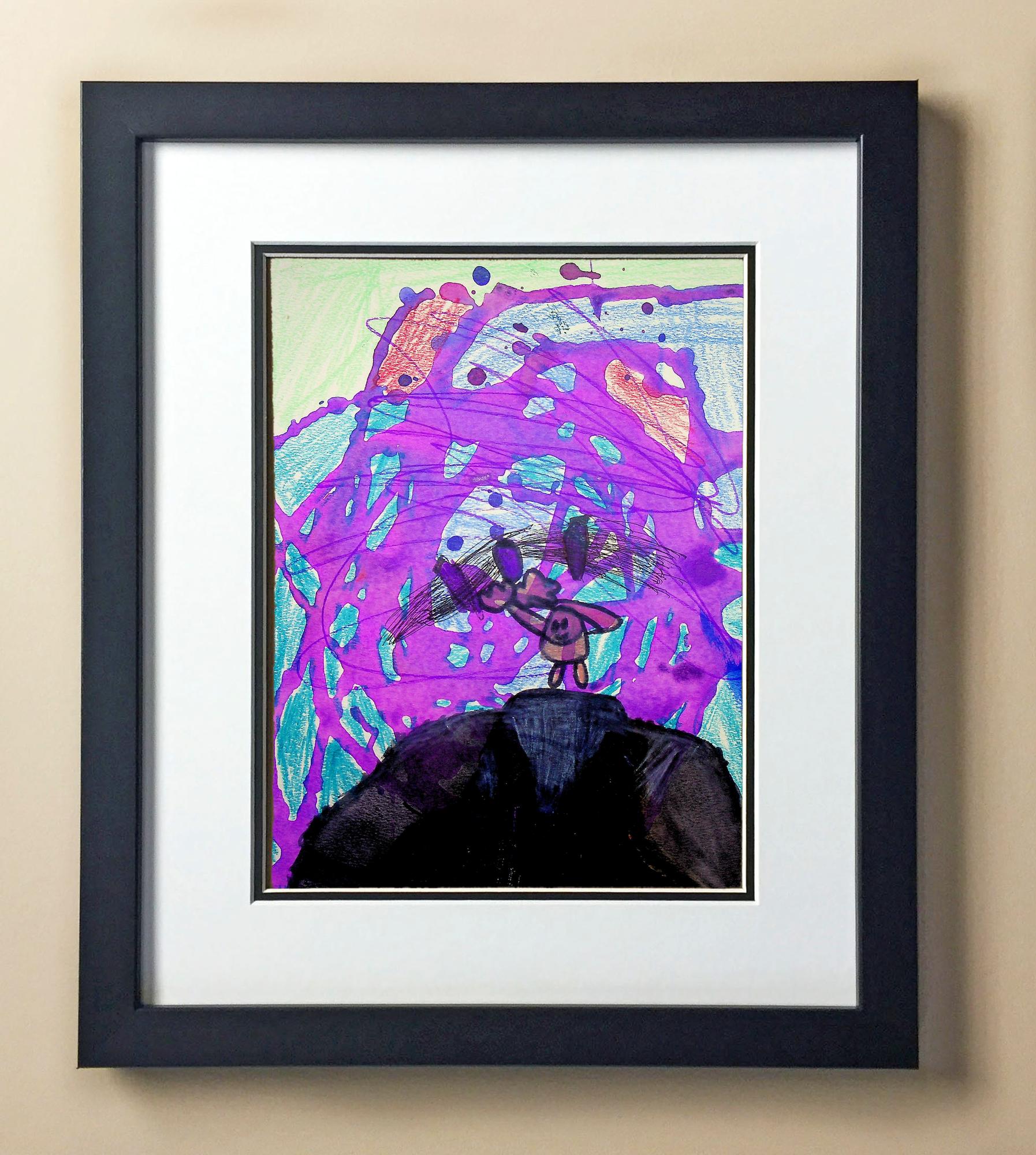 Included with the purchase is the Students Artwork, Frame, double matboard, shatter proof plexiglass, and a ready to hang backerboard with turnbuttons