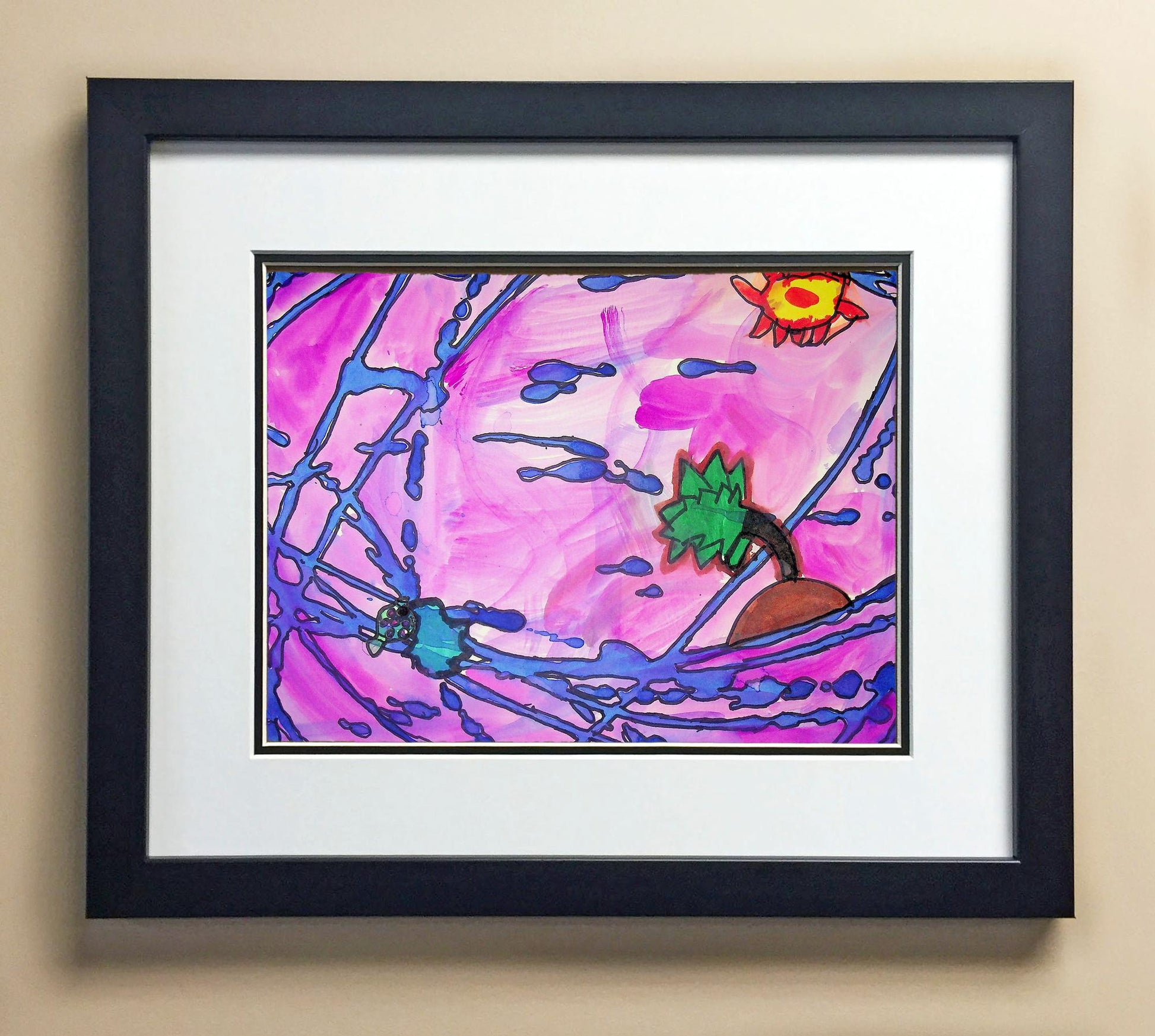 Included with the purchase is the Students Artwork, Frame, double matboard, shatter proof plexiglass, and a ready to hang backerboard with turnbuttons