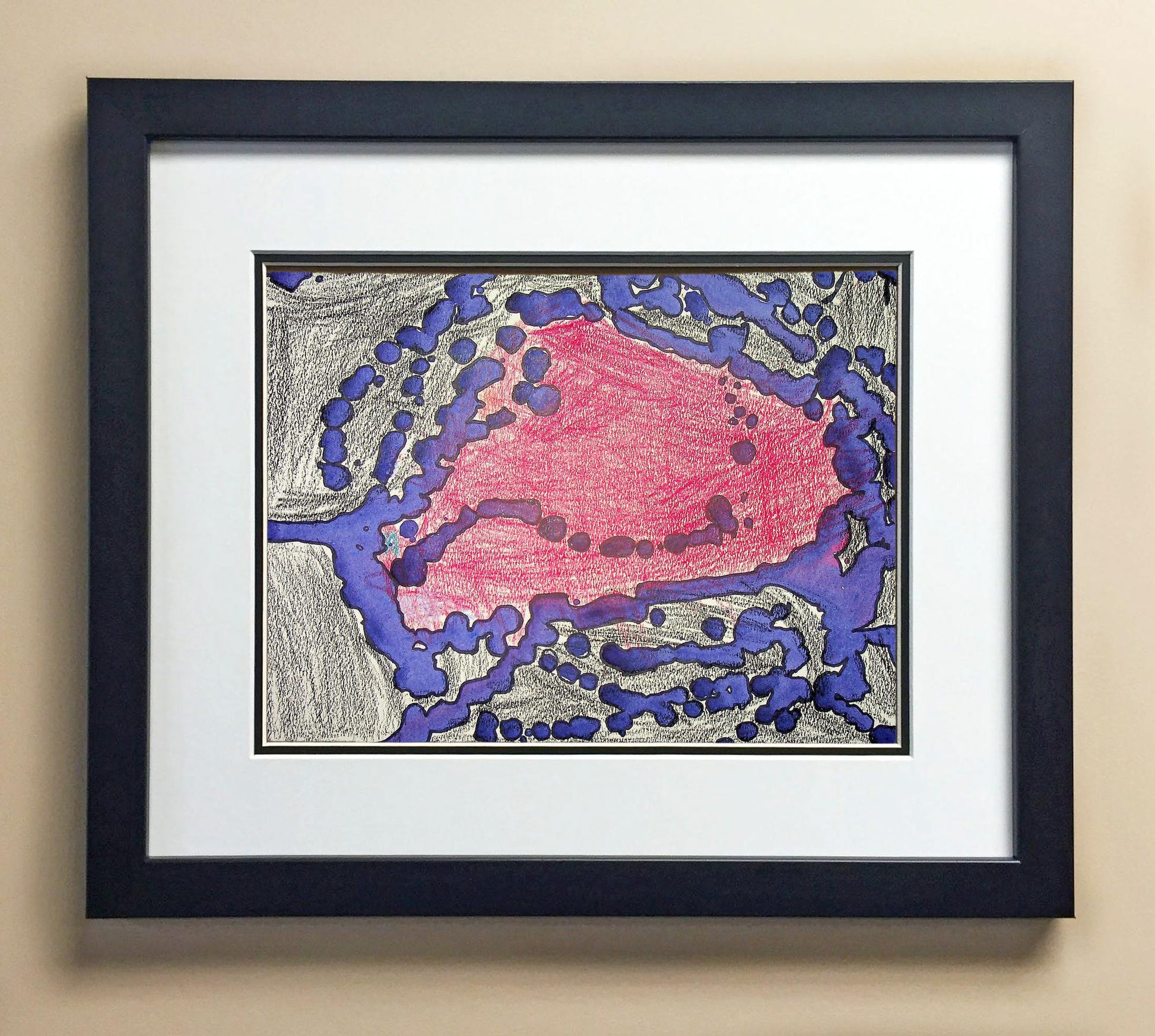 Included with the purchase is the Students Artwork, Frame, double matboard, shatter proof plexiglass, and a ready to hang backerboard with turnbuttons