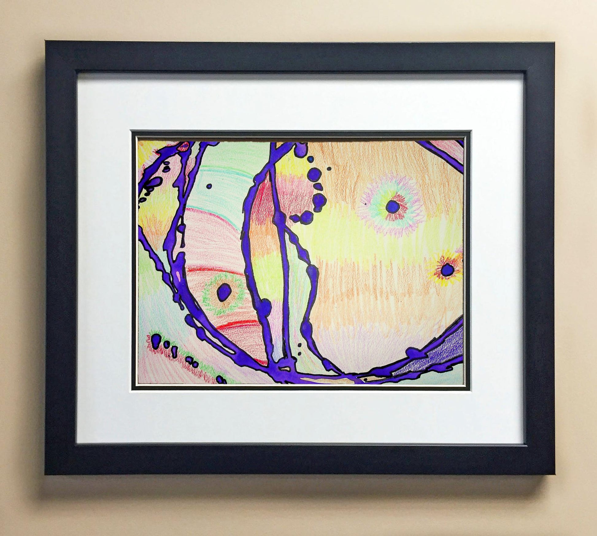 Included with the purchase is the Students Artwork, Frame, double matboard, shatter proof plexiglass, and a ready to hang backerboard with turnbuttons