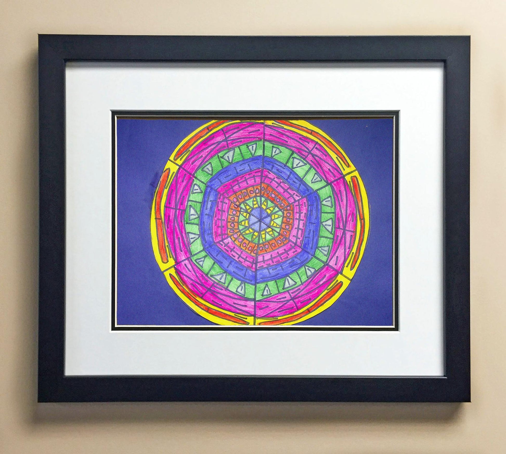 Included with the purchase is the Students Artwork, Frame, double matboard, shatter proof plexiglass, and a ready to hang backerboard with turnbuttons