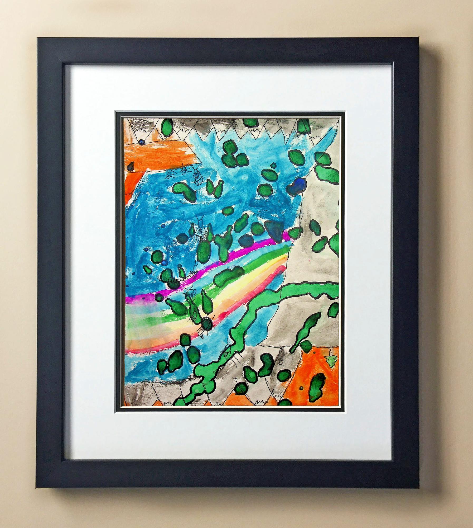 Included with the purchase is the Students Artwork, Frame, double matboard, shatter proof plexiglass, and a ready to hang backerboard with turnbuttons