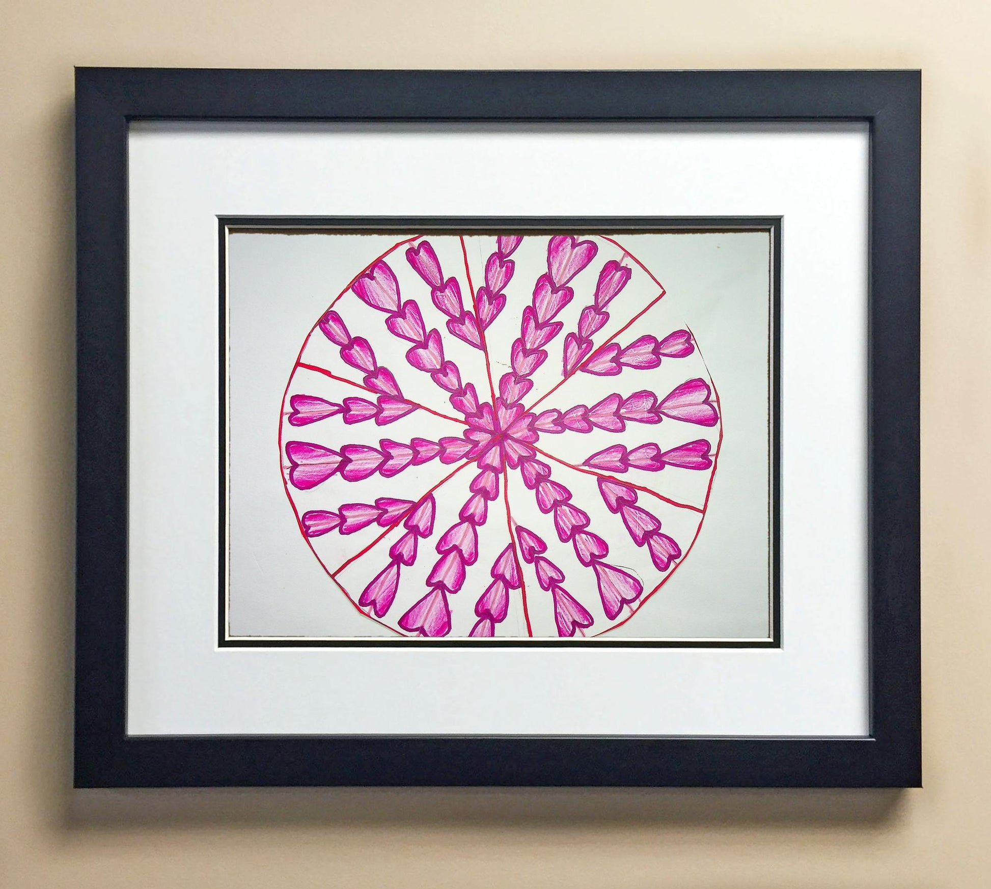 Included with the purchase is the Students Artwork, Frame, double matboard, shatter proof plexiglass, and a ready to hang backerboard with turnbuttons