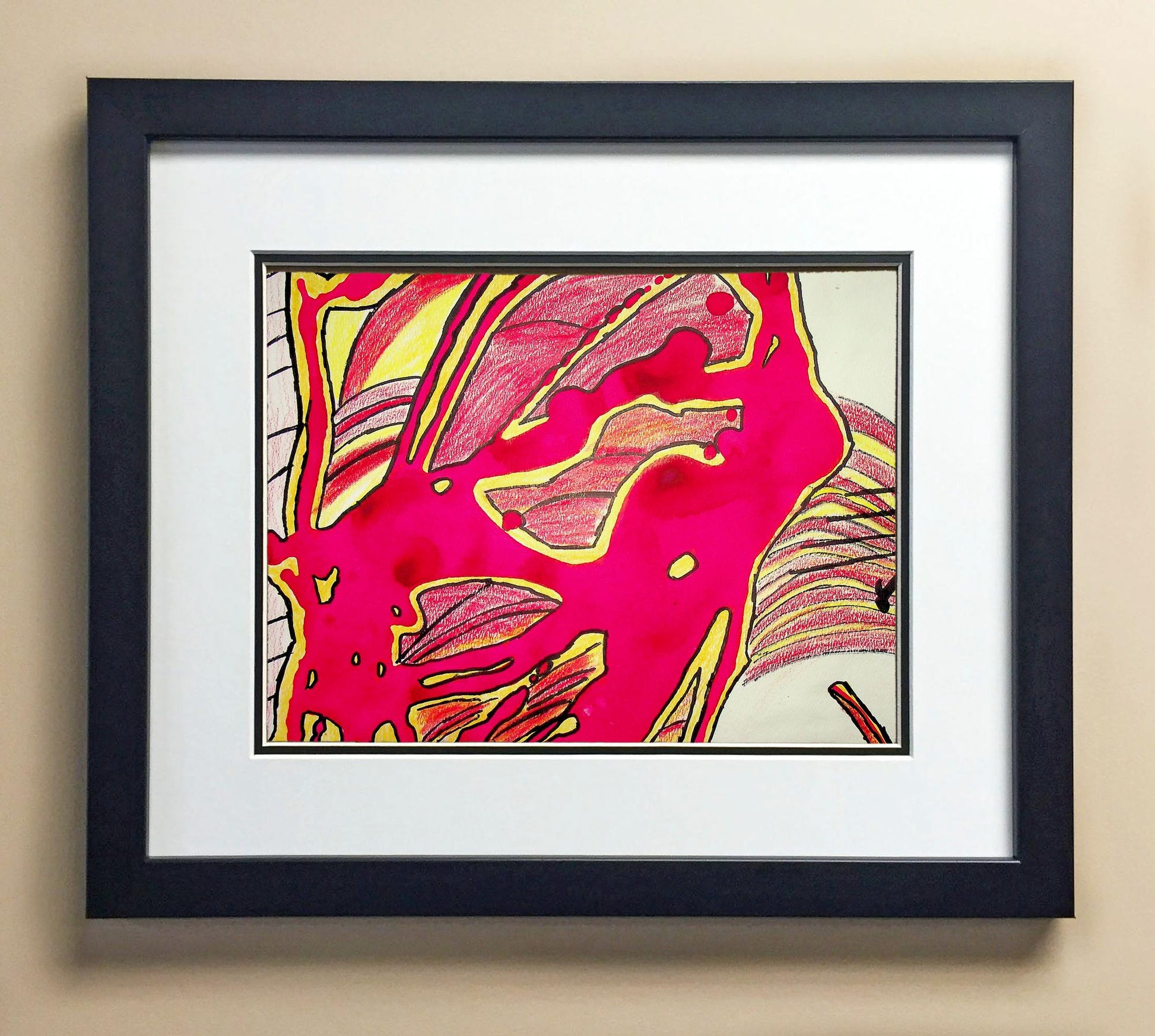 Included with the purchase is the Students Artwork, Frame, double matboard, shatter proof plexiglass, and a ready to hang backerboard with turnbuttons