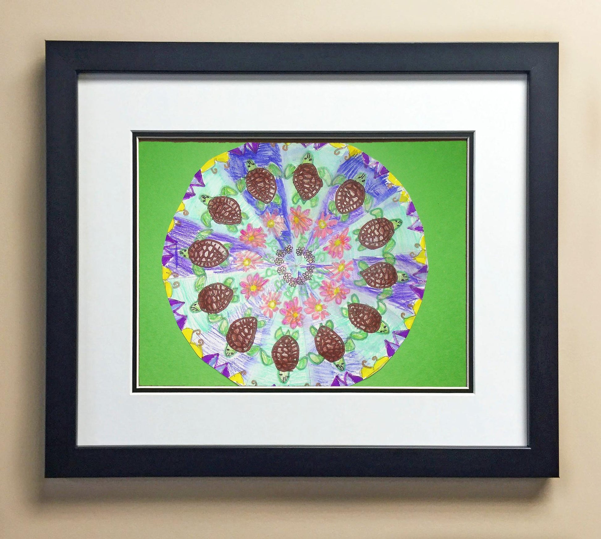 Included with the purchase is the Students Artwork, Frame, double matboard, shatter proof plexiglass, and a ready to hang backerboard with turnbuttons