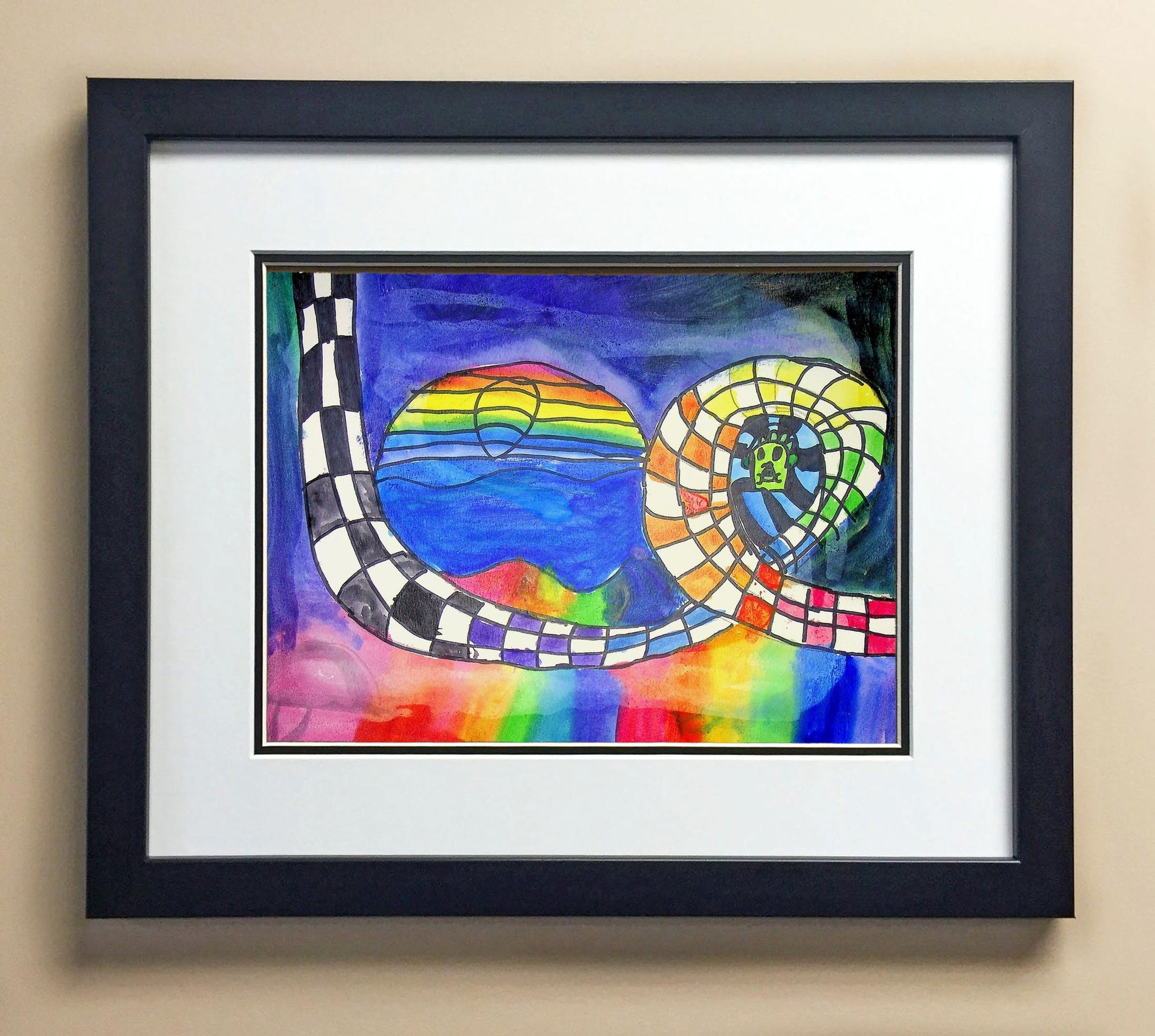 Included with the purchase is the Students Artwork, Frame, double matboard, shatter proof plexiglass, and a ready to hang backerboard with turnbuttons