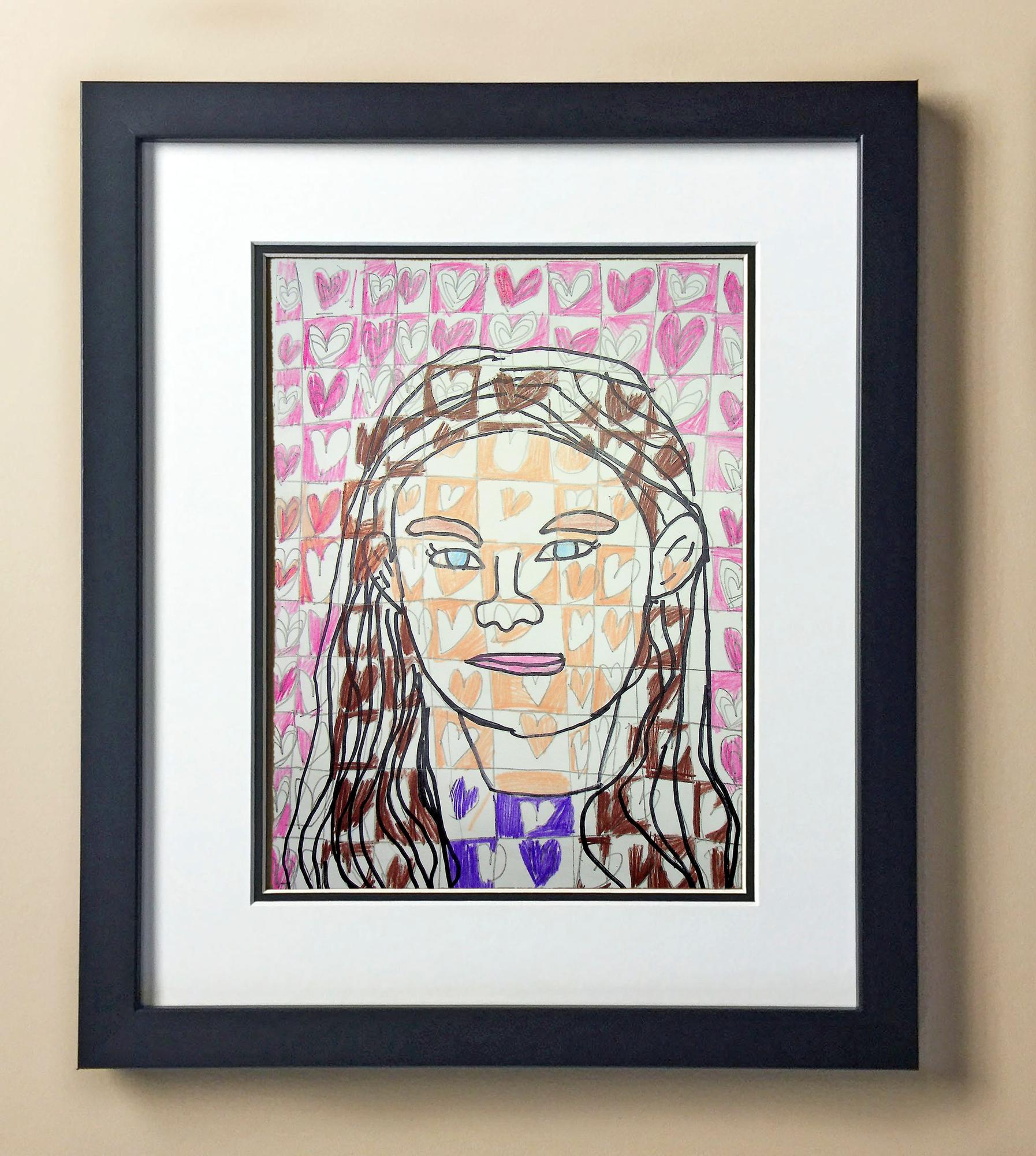 Included with the purchase is the Students Artwork, Frame, double matboard, shatter proof plexiglass, and a ready to hang backerboard with turnbuttons
