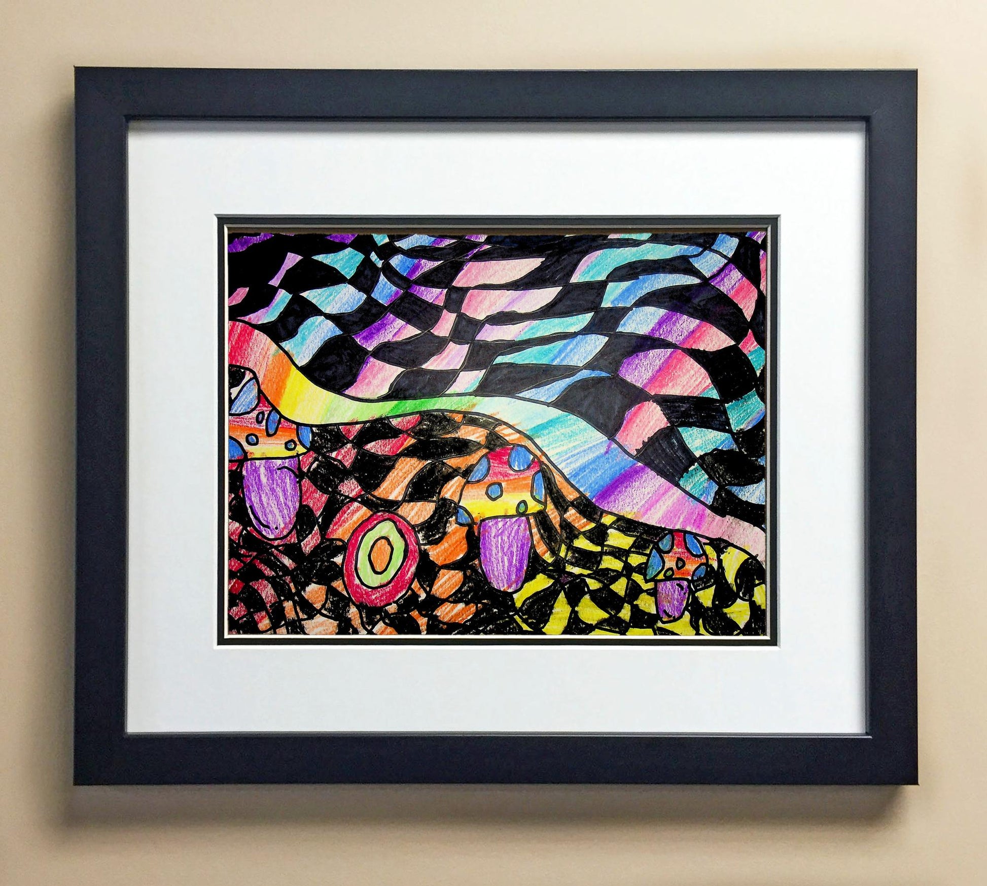 Included with the purchase is the Students Artwork, Frame, double matboard, shatter proof plexiglass, and a ready to hang backerboard with turnbuttons