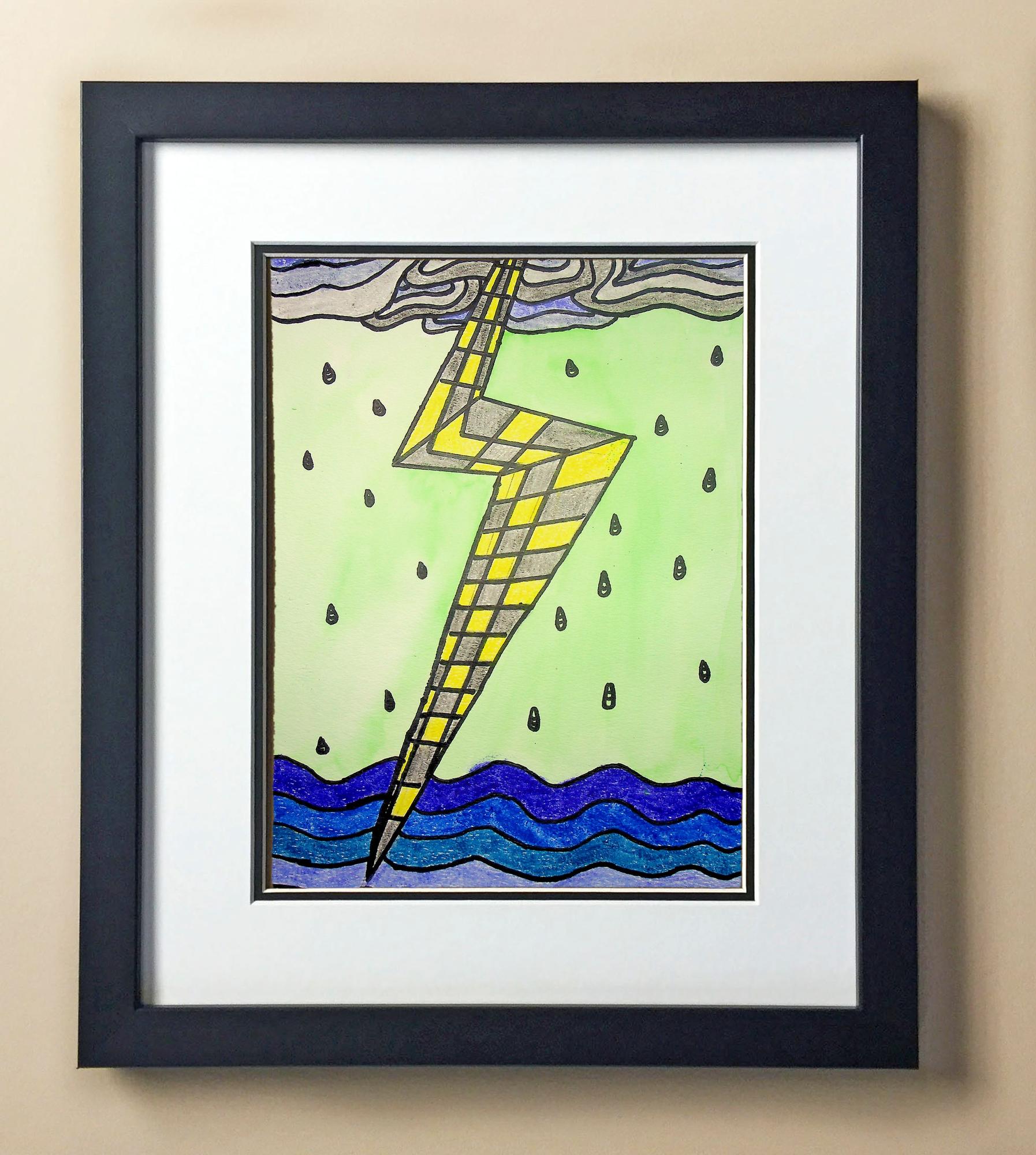 Included with the purchase is the Students Artwork, Frame, double matboard, shatter proof plexiglass, and a ready to hang backerboard with turnbuttons