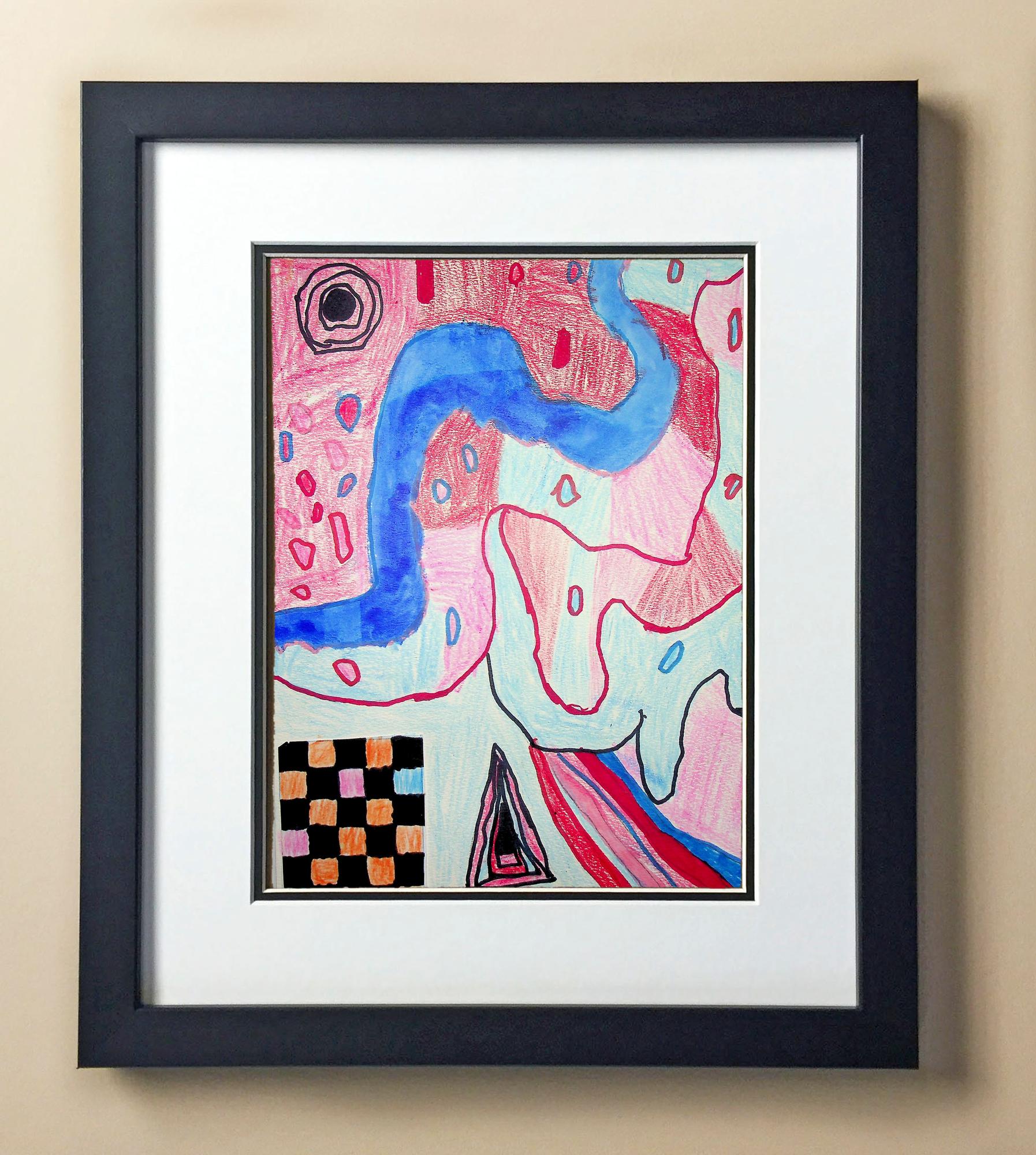Included with the purchase is the Students Artwork, Frame, double matboard, shatter proof plexiglass, and a ready to hang backerboard with turnbuttons