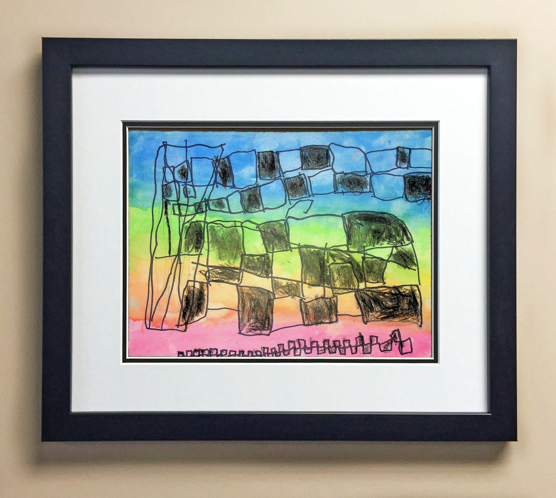 Included with the purchase is the Students Artwork, Frame, double matboard, shatter proof plexiglass, and a ready to hang backerboard with turnbuttons